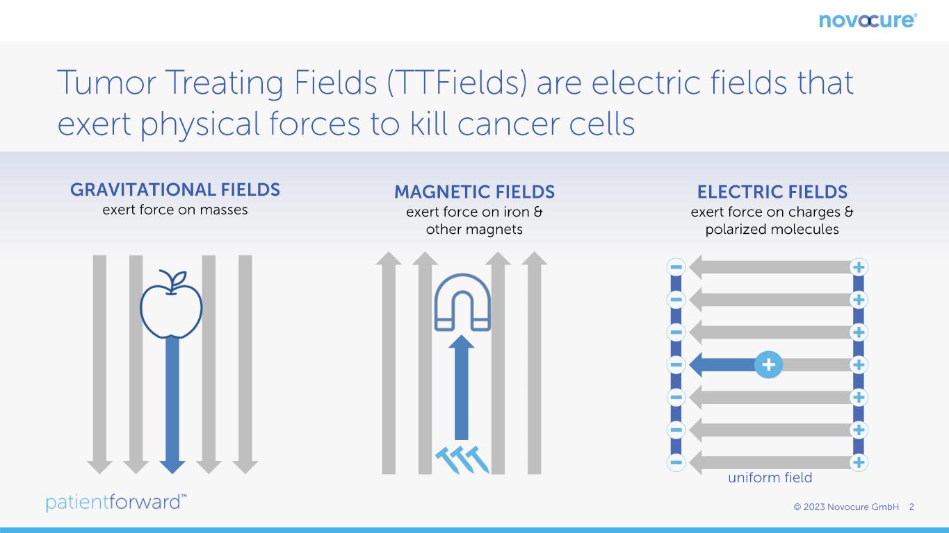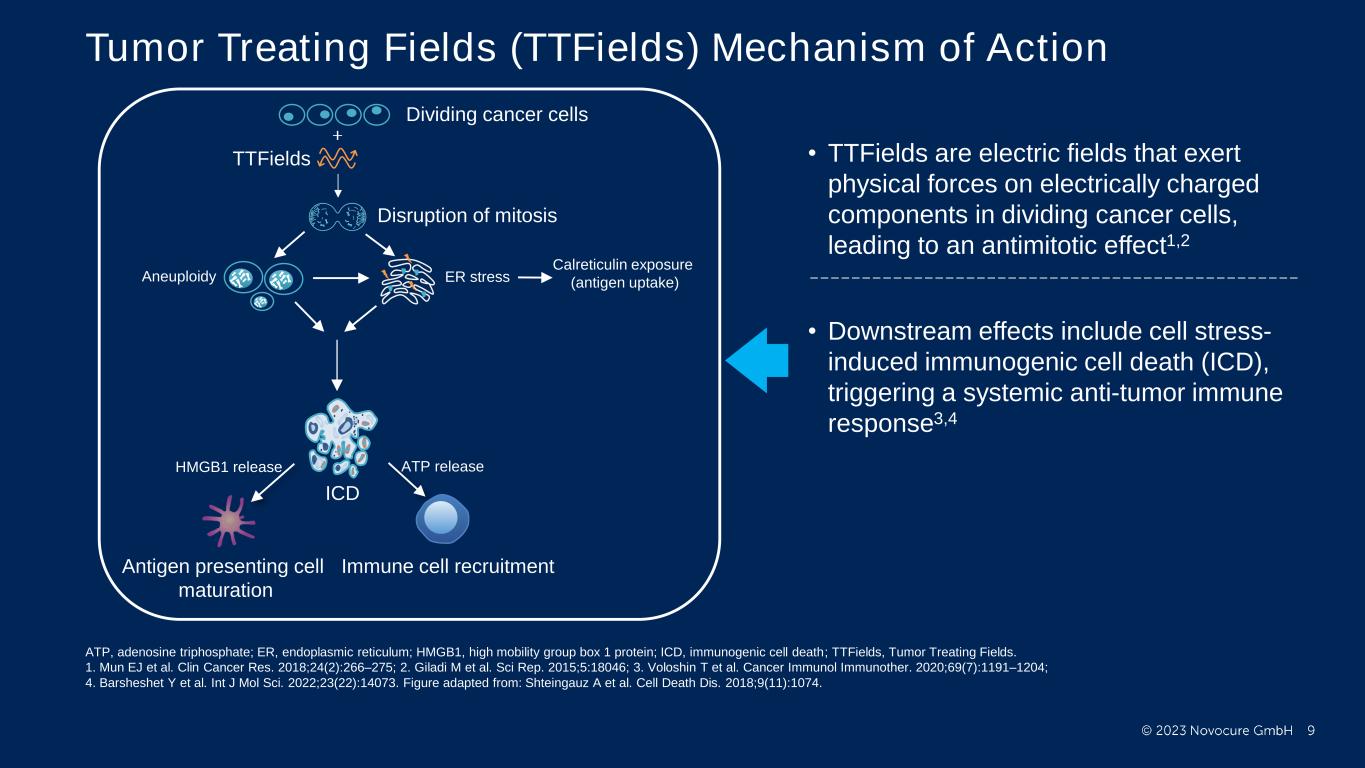 PRESENTED BY: Tumor Treating Fields (TTFields) Mechanism of Action Dividing cancer cells TTFields Aneuploidy ER stress ICD Immune cell recruitmentAntigen presenting cell maturation HMGB1 release ATP release Calreticulin exposure (antigen uptake) Disruption of mitosis • TTFields are electric fields that exert physical forces on electrically charged components in dividing cancer cells, leading to an antimitotic effect1,2 • Downstream effects include cell stress- induced immunogenic cell death (ICD), triggering a systemic anti-tumor immune response3,4 ATP, adenosine triphosphate; ER, endoplasmic reticulum; HMGB1, high mobility group box 1 protein; ICD, immunogenic cell death; TTFields, Tumor Treating Fields. 1. Mun EJ et al. Clin Cancer Res. 2018;24(2):266–275; 2. Giladi M et al. Sci Rep. 2015;5:18046; 3. Voloshin T et al. Cancer Immunol Immunother. 2020;69(7):1191–1204; 4. Barsheshet Y et al. Int J Mol Sci. 2022;23(22):14073. Figure adapted from: Shteingauz A et al. Cell Death Dis. 2018;9(11):1074.