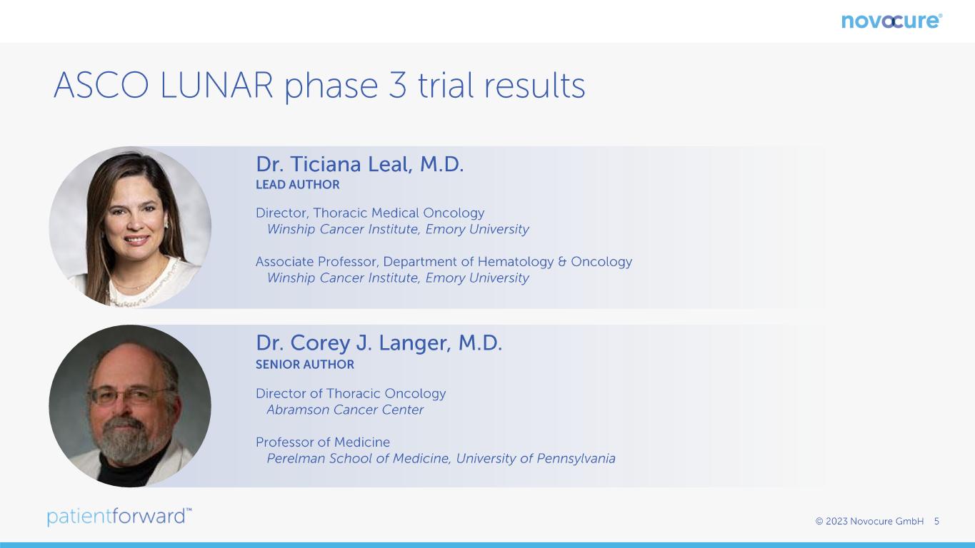 PRESENTED BY: Tumor Treating Fields (TTFields) Therapy with Standard of Care (SOC) in Metastatic Non-Small Cell Lung Cancer (mNSCLC) After Platinum-based Therapies: Randomized, Phase 3 LUNAR Study Ticiana Leal, MD, Winship Cancer Institute - Emory University Ticiana Leal1, Rupesh Kotecha2, Rodryg Ramlau3, Li Zhang4, Janusz Milanowski5, Manuel Cobo6, Jaromir Roubec7, Lubos Petruzelka8, Libor Havel9, Sujith Kalmadi10, Jeffrey Ward11, Zoran Andric12, Thierry Berghmans13, David E. Gerber14, Goetz Kloecker15, Rajiv Panikkar16, Joachim Aerts17, Angelo Delmonte18, Miklos Pless19, Richard Greil20, Christian Rolfo21, Wallace Akerley22, Michael Eaton23, Mussawar Iqbal24, and Corey Langer25; on behalf of the LUNAR study investigators 1Winship Cancer Institute at Emory University, Atlanta, GA, USA; 2Miami Cancer Institute, Baptist Health South Florida, Miami, FL, USA; 3Rodryg Ramlau, Poznan University of Medical Sciences, Poznan, Poland; 4Sun Yat-sen University Cancer Center (SYSUCC), Guangzhou, China; 5Medical University of Lublin, Lublin, Poland; 6Medical Oncology Intercenter Unit, Regional and Virgen de la Victoria University Hospitals, IBIMA, Málaga, Spain; 7Nemocnice AGEL Ostrava-Vítkovice, Ostrava, Czech Republic; 8General University Hospital in Prague, Prague, Czech Republic; 9Thomayer Hospital, Prague, Czech Republic; 10Ironwood Cancer & Research Centers, Chandler, AZ, USA; 11Washington University School of Medicine, St. Louis, MO, USA; 12Clinical Hospital Centre Bezanijska Kosa, Belgrade, Serbia; 13Jules Bordet Institute, Hôpitaux Universitaires de Bruxelles, Université Libre de Bruxelles, Brussels, Belgium; 14Harold C. Simmons Comprehensive Cancer Center, UT Texas Southwestern Medical Center, Dallas, TX, USA; 15University of Louisville, Louisville, KY, USA; 16Geisinger Cancer Institute, Danville, PA, USA; 17Erasmus University Medical Center, Erasmus MC Cancer Institute, Rotterdam, The Netherlands; 18IRCCS Istituto Romagnolo per lo Studio dei Tumori "Dino Amadori" (IRST), Meldola, Italy, Meldola, Italy; 19Kantonsspital Winterthur, Winterthur, Switzerland; 20Salzburg Cancer Research Institute-Center for Clinical Cancer and Immunology Trials (SCRI-CCCIT); Paracelsus Medical University Salzburg; Cancer Cluster, Salzburg, Austria; 21Center for Thoracic Oncology, Tisch Cancer Institute at Icahn School of Medicine, Mount Sinai, New York, NY, USA; 22Huntsman Cancer Institute, University of Utah, Salt Lake City, UT, USA; 23St Francis Hospital, Indianapolis, IN, USA; 24College of Medicine, University of Saskatchewan, Saskatoon, Canada; 25Abramson Cancer Center, Perelman School of Medicine, University of Pennsylvania, PA, USA