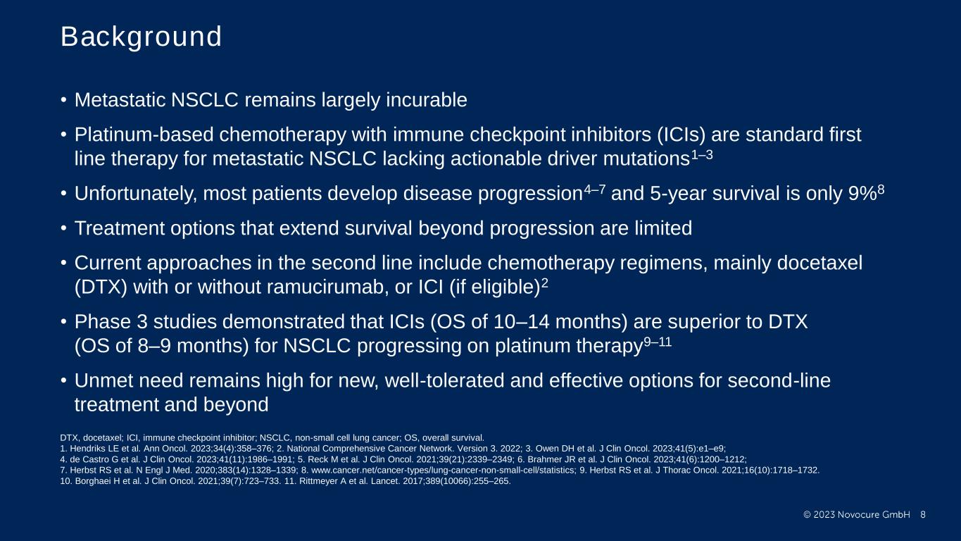 PRESENTED BY: Background • Metastatic NSCLC remains largely incurable • Platinum-based chemotherapy with immune checkpoint inhibitors (ICIs) are standard first line therapy for metastatic NSCLC lacking actionable driver mutations1–3 • Unfortunately, most patients develop disease progression4–7 and 5-year survival is only 9%8 • Treatment options that extend survival beyond progression are limited • Current approaches in the second line include chemotherapy regimens, mainly docetaxel (DTX) with or without ramucirumab, or ICI (if eligible)2 • Phase 3 studies demonstrated that ICIs (OS of 10–14 months) are superior to DTX (OS of 8–9 months) for NSCLC progressing on platinum therapy9–11 • Unmet need remains high for new, well-tolerated and effective options for second-line treatment and beyond DTX, docetaxel; ICI, immune checkpoint inhibitor; NSCLC, non-small cell lung cancer; OS, overall survival. 1. Hendriks LE et al. Ann Oncol. 2023;34(4):358–376; 2. National Comprehensive Cancer Network. Version 3. 2022; 3. Owen DH et al. J Clin Oncol. 2023;41(5):e1–e9; 4. de Castro G et al. J Clin Oncol. 2023;41(11):1986–1991; 5. Reck M et al. J Clin Oncol. 2021;39(21):2339–2349; 6. Brahmer JR et al. J Clin Oncol. 2023;41(6):1200–1212; 7. Herbst RS et al. N Engl J Med. 2020;383(14):1328–1339; 8. www.cancer.net/cancer-types/lung-cancer-non-small-cell/statistics; 9. Herbst RS et al. J Thorac Oncol. 2021;16(10):1718–1732. 10. Borghaei H et al. J Clin Oncol. 2021;39(7):723–733. 11. Rittmeyer A et al. Lancet. 2017;389(10066):255–265.