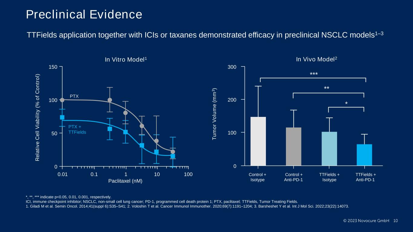 PRESENTED BY: Preclinical Evidence Ticiana Leal, MD, Winship Cancer Institute - Emory University PTX PTX + TTFields In Vitro Model1 150 100 50 0 0.01 0.1 1 10010 Paclitaxel (nM) R e la ti v e C e ll V ia b il it y ( % o f C o n tr o l) 300 0 200 100 Control + Isotype Control + Anti-PD-1 TTFields + Isotype TTFields + Anti-PD-1 * ** *** T u m o r V o lu m e ( m m 3 ) In Vivo Model2 TTFields application together with ICIs or taxanes demonstrated efficacy in preclinical NSCLC models1–3 *, **, *** indicate p<0.05, 0.01, 0.001, respectively. ICI, immune checkpoint inhibitor; NSCLC, non-small cell lung cancer; PD-1, programmed cell death protein 1; PTX, paclitaxel; TTFields, Tumor Treating Fields. 1. Giladi M et al. Semin Oncol. 2014;41(suppl 6):S35–S41; 2. Voloshin T et al. Cancer Immunol Immunother. 2020;69(7):1191–1204; 3. Barsheshet Y et al. Int J Mol Sci. 2022;23(22):14073.