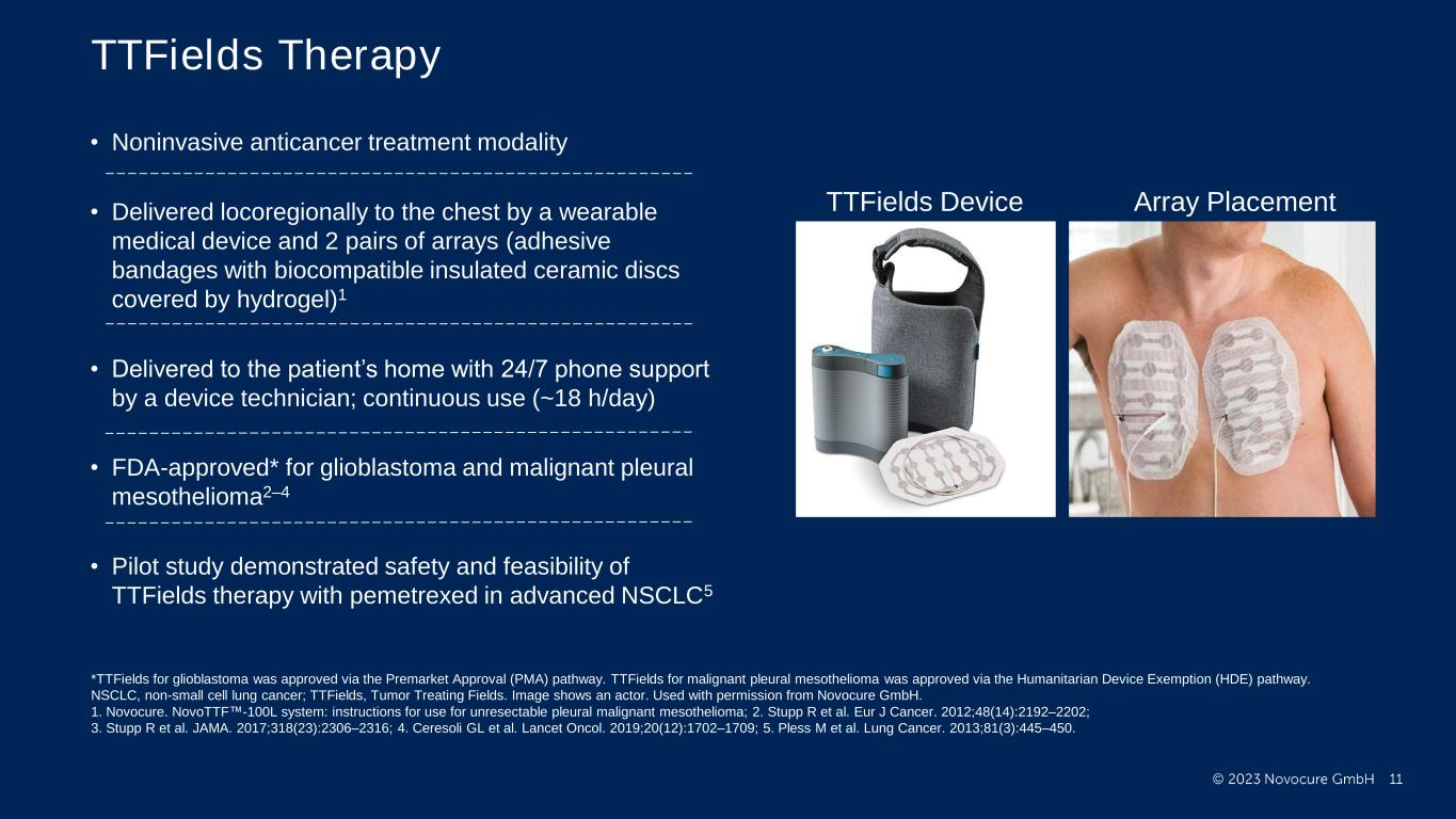 PRESENTED BY: TTFields Therapy • Noninvasive anticancer treatment modality • Delivered locoregionally to the chest by a wearable medical device and 2 pairs of arrays (adhesive bandages with biocompatible insulated ceramic discs covered by hydrogel)1 • Delivered to the patient’s home with 24/7 phone support by a device technician; continuous use (~18 h/day) • FDA-approved* for glioblastoma and malignant pleural mesothelioma2–4 • Pilot study demonstrated safety and feasibility of TTFields therapy with pemetrexed in advanced NSCLC5 Ticiana Leal, MD, Winship Cancer Institute - Emory University TTFields Device Array Placement *TTFields for glioblastoma was approved via the Premarket Approval (PMA) pathway. TTFields for malignant pleural mesothelioma was approved via the Humanitarian Device Exemption (HDE) pathway. NSCLC, non-small cell lung cancer; TTFields, Tumor Treating Fields. Image shows an actor. Used with permission from Novocure GmbH. 1. Novocure. NovoTTF™-100L system: instructions for use for unresectable pleural malignant mesothelioma; 2. Stupp R et al. Eur J Cancer. 2012;48(14):2192–2202; 3. Stupp R et al. JAMA. 2017;318(23):2306–2316; 4. Ceresoli GL et al. Lancet Oncol. 2019;20(12):1702–1709; 5. Pless M et al. Lung Cancer. 2013;81(3):445–450.