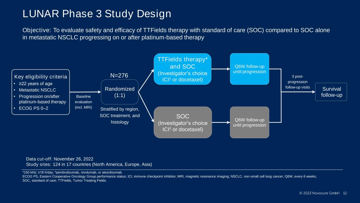 PRESENTED BY: LUNAR Phase 3 Study Design Key eligibility criteria • ≥22 years of age • Metastatic NSCLC • Progression on/after platinum-based therapy • ECOG PS 0–2 Randomized (1:1) TTFields therapy* and SOC (Investigator’s choice ICI† or docetaxel) SOC (Investigator’s choice ICI† or docetaxel) Baseline evaluation (incl. MRI) N=276 Data cut-off: November 26, 2022 Study sites: 124 in 17 countries (North America, Europe, Asia) Objective: To evaluate safety and efficacy of TTFields therapy with standard of care (SOC) compared to SOC alone in metastatic NSCLC progressing on or after platinum-based therapy Q6W follow-up until progression Q6W follow-up until progression Survival follow-up 3 post- progression follow-up visits Stratified by region, SOC treatment, and histology *150 kHz; ≥18 h/day; †pembrolizumab, nivolumab, or atezolizumab. ECOG PS, Eastern Cooperative Oncology Group performance status; ICI, immune checkpoint inhibitor; MRI, magnetic resonance imaging; NSCLC, non-small cell lung cancer; Q6W, every 6 weeks; SOC, standard of care; TTFields, Tumor Treating Fields.