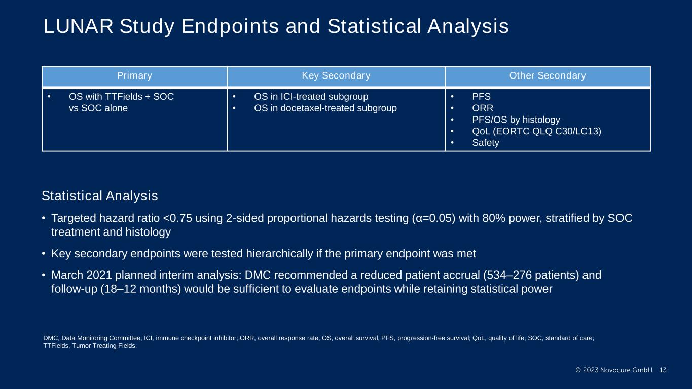 PRESENTED BY: LUNAR Study Endpoints and Statistical Analysis Statistical Analysis • Targeted hazard ratio <0.75 using 2-sided proportional hazards testing (α=0.05) with 80% power, stratified by SOC treatment and histology • Key secondary endpoints were tested hierarchically if the primary endpoint was met • March 2021 planned interim analysis: DMC recommended a reduced patient accrual (534–276 patients) and follow-up (18–12 months) would be sufficient to evaluate endpoints while retaining statistical power Primary Key Secondary Other Secondary • OS with TTFields + SOC vs SOC alone • OS in ICI-treated subgroup • OS in docetaxel-treated subgroup • PFS • ORR • PFS/OS by histology • QoL (EORTC QLQ C30/LC13) • Safety DMC, Data Monitoring Committee; ICI, immune checkpoint inhibitor; ORR, overall response rate; OS, overall survival, PFS, progression-free survival; QoL, quality of life; SOC, standard of care; TTFields, Tumor Treating Fields.