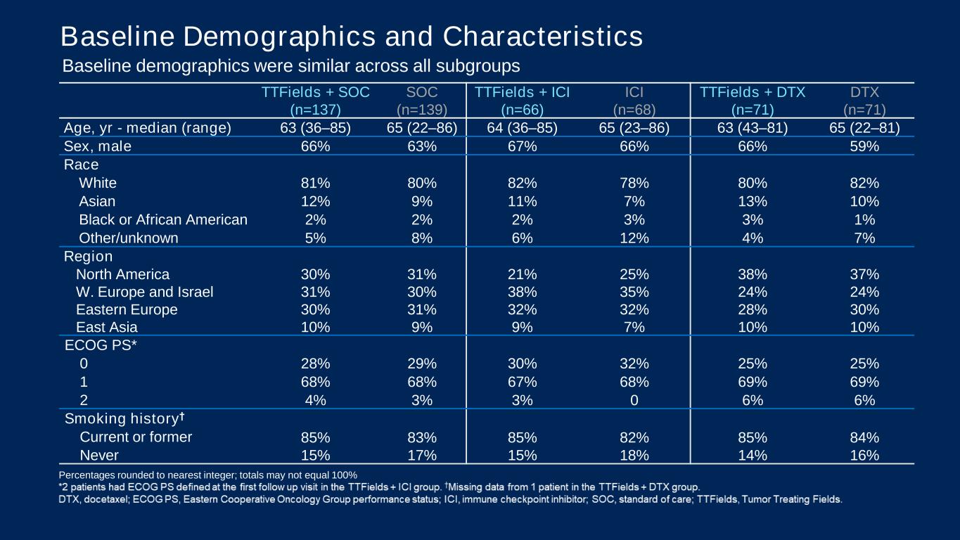 PRESENTED BY: TTFields + SOC (n=137) SOC (n=139) TTFields + ICI (n=66) ICI (n=68) TTFields + DTX (n=71) DTX (n=71) Age, yr - median (range) 63 (36–85) 65 (22–86) 64 (36–85) 65 (23–86) 63 (43–81) 65 (22–81) Sex, male 66% 63% 67% 66% 66% 59% Race White 81% 80% 82% 78% 80% 82% Asian 12% 9% 11% 7% 13% 10% Black or African American 2% 2% 2% 3% 3% 1% Other/unknown 5% 8% 6% 12% 4% 7% Region North America 30% 31% 21% 25% 38% 37% W. Europe and Israel 31% 30% 38% 35% 24% 24% Eastern Europe 30% 31% 32% 32% 28% 30% East Asia 10% 9% 9% 7% 10% 10% ECOG PS* 0 28% 29% 30% 32% 25% 25% 1 68% 68% 67% 68% 69% 69% 2 4% 3% 3% 0 6% 6% Smoking history† Current or former 85% 83% 85% 82% 85% 84% Never 15% 17% 15% 18% 14% 16% Baseline Demographics and Characteristics Baseline demographics were similar across all subgroups Percentages rounded to nearest integer; totals may not equal 100%