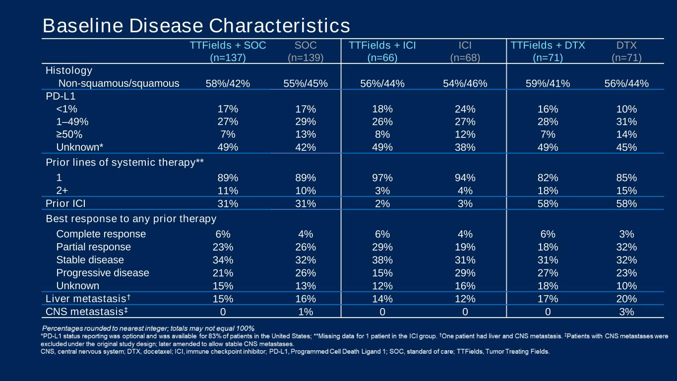 PRESENTED BY: Baseline Disease Characteristics TTFields + SOC (n=137) SOC (n=139) TTFields + ICI (n=66) ICI (n=68) TTFields + DTX (n=71) DTX (n=71) Histology Non-squamous/squamous 58%/42% 55%/45% 56%/44% 54%/46% 59%/41% 56%/44% PD-L1 <1% 17% 17% 18% 24% 16% 10% 1–49% 27% 29% 26% 27% 28% 31% ≥50% 7% 13% 8% 12% 7% 14% Unknown* 49% 42% 49% 38% 49% 45% Prior lines of systemic therapy** 1 89% 89% 97% 94% 82% 85% 2+ 11% 10% 3% 4% 18% 15% Prior ICI 31% 31% 2% 3% 58% 58% Best response to any prior therapy Complete response 6% 4% 6% 4% 6% 3% Partial response 23% 26% 29% 19% 18% 32% Stable disease 34% 32% 38% 31% 31% 32% Progressive disease 21% 26% 15% 29% 27% 23% Unknown 15% 13% 12% 16% 18% 10% Liver metastasis† 15% 16% 14% 12% 17% 20% CNS metastasis‡ 0 1% 0 0 0 3%