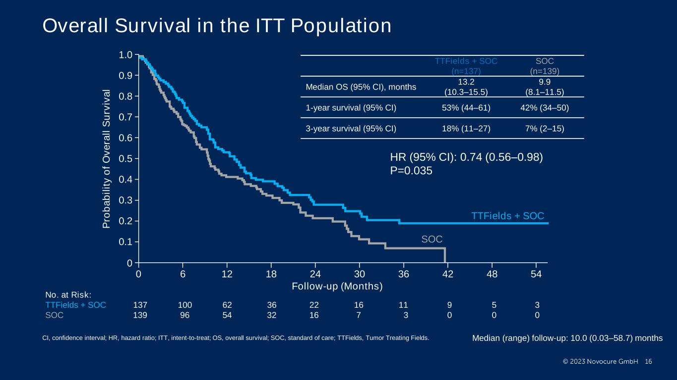 PRESENTED BY: Ticiana Leal, MD, Winship Cancer Institute - Emory University Overall Survival in the ITT Population TTFields + SOC (n=137) SOC (n=139) Median OS (95% CI), months 13.2 (10.3–15.5) 9.9 (8.1–11.5) 1-year survival (95% CI) 53% (44–61) 42% (34–50) 3-year survival (95% CI) 18% (11–27) 7% (2–15) Follow-up (Months) No. at Risk: TTFields + SOC 137 100 62 36 22 16 11 9 5 3 SOC 139 96 54 32 16 7 3 0 0 0 TTFields + SOC SOC 0 0 6 12 48 544236302418 1.0 P ro b a b il it y o f O v e ra ll S u rv iv a l 0.8 0.6 0.4 0.2 0.9 0.7 0.5 0.3 0.1 Median (range) follow-up: 10.0 (0.03–58.7) months HR (95% CI): 0.74 (0.56–0.98) P=0.035 CI, confidence interval; HR, hazard ratio; ITT, intent-to-treat; OS, overall survival; SOC, standard of care; TTFields, Tumor Treating Fields.