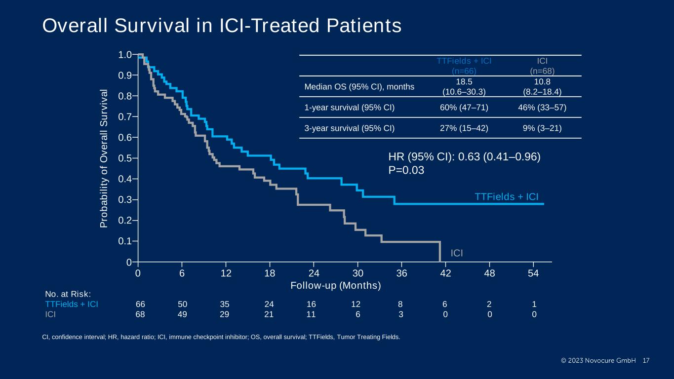 PRESENTED BY: Ticiana Leal, MD, Winship Cancer Institute - Emory University Overall Survival in ICI-Treated Patients No. at Risk: TTFields + ICI 66 50 35 24 16 12 8 6 2 1 ICI 68 49 29 21 11 6 3 0 0 0 1.0 P ro b a b il it y o f O v e ra ll S u rv iv a l 0.8 0.6 0.4 0.2 0 0.9 0.7 0.5 0.3 0.1 0 6 12 48 544236302418 TTFields + ICI ICI Follow-up (Months) TTFields + ICI (n=66) ICI (n=68) Median OS (95% CI), months 18.5 (10.6–30.3) 10.8 (8.2–18.4) 1-year survival (95% CI) 60% (47–71) 46% (33–57) 3-year survival (95% CI) 27% (15–42) 9% (3–21) HR (95% CI): 0.63 (0.41–0.96) P=0.03 CI, confidence interval; HR, hazard ratio; ICI, immune checkpoint inhibitor; OS, overall survival; TTFields, Tumor Treating Fields.