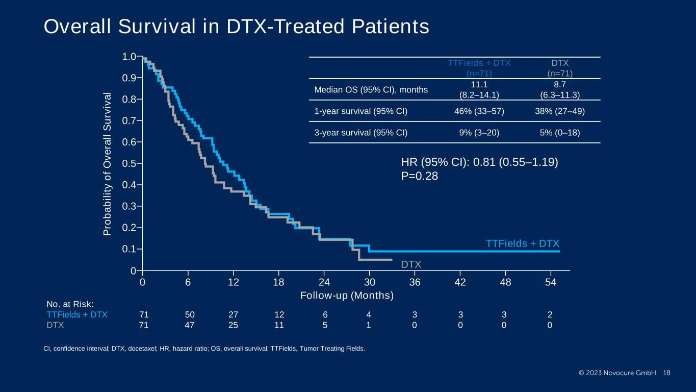 PRESENTED BY: 1.0 0.8 0.6 0.4 0.2 0 0.9 0.7 0.5 0.3 0.1 0 6 12 48 544236302418 TTFields + DTX DTX Follow-up (Months) No. at Risk: TTFields + DTX 71 50 27 12 6 4 3 3 3 2 DTX 71 47 25 11 5 1 0 0 0 0 Ticiana Leal, MD, Winship Cancer Institute - Emory University Overall Survival in DTX-Treated Patients P ro b a b il it y o f O v e ra ll S u rv iv a l TTFields + DTX (n=71) DTX (n=71) Median OS (95% CI), months 11.1 (8.2–14.1) 8.7 (6.3–11.3) 1-year survival (95% CI) 46% (33–57) 38% (27–49) 3-year survival (95% CI) 9% (3–20) 5% (0–18) HR (95% CI): 0.81 (0.55–1.19) P=0.28 CI, confidence interval; DTX, docetaxel; HR, hazard ratio; OS, overall survival; TTFields, Tumor Treating Fields.