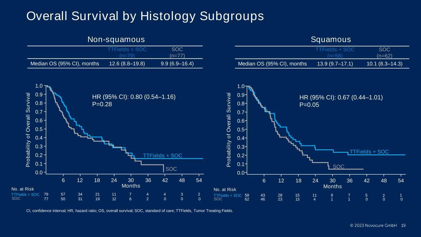 PRESENTED BY: TTFields + SOC SOC 1.0 0.9 0.3 0.4 0.5 0.6 0.7 0.8 0.2 0.1 0.0 6 12 18 24 30 36 42 48 54 46 43 28 15 11 9 7 5 2 158 62 23 13 4 1 1 Months TTFields + SOC SOC No. at Risk 000SOC TTFields + SOC No. at Risk TTFields + SOC SOC 1.0 0.9 0.3 0.4 0.5 0.6 0.7 0.8 0.2 0.1 0.0 Months 6 12 18 24 30 36 42 48 54 57 34 21 11 7 4 4 3 2 50 79 77 31 19 6 212 00 0 Overall Survival by Histology Subgroups TTFields + SOC (n=79) SOC (n=77) Median OS (95% CI), months 12.6 (8.8–19.8) 9.9 (6.9–16.4) TTFields + SOC (n=58) SOC (n=62) Median OS (95% CI), months 13.9 (9.7–17.1) 10.1 (8.3–14.3) Non-squamous Squamous P ro b a b il it y o f O v e ra ll S u rv iv a l P ro b a b il it y o f O v e ra ll S u rv iv a l HR (95% CI): 0.80 (0.54–1.16) P=0.28 HR (95% CI): 0.67 (0.44–1.01) P=0.05 CI, confidence interval; HR, hazard ratio; OS, overall survival; SOC, standard of care; TTFields, Tumor Treating Fields.