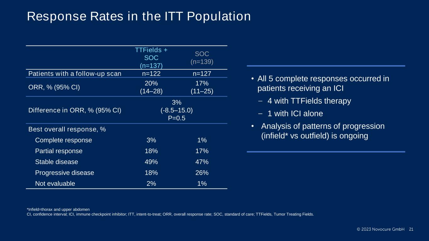 PRESENTED BY: Response Rates in the ITT Population TTFields + SOC (n=137) SOC (n=139) Patients with a follow-up scan n=122 n=127 ORR, % (95% CI) 20% (14–28) 17% (11–25) Difference in ORR, % (95% CI) 3% (-8.5–15.0) P=0.5 Best overall response, % Complete response 3% 1% Partial response 18% 17% Stable disease 49% 47% Progressive disease 18% 26% Not evaluable 2% 1% • All 5 complete responses occurred in patients receiving an ICI 4 with TTFields therapy 1 with ICI alone • Analysis of patterns of progression (infield* vs outfield) is ongoing *Infield=thorax and upper abdomen CI, confidence interval; ICI, immune checkpoint inhibitor; ITT, intent-to-treat; ORR, overall response rate; SOC, standard of care; TTFields, Tumor Treating Fields.