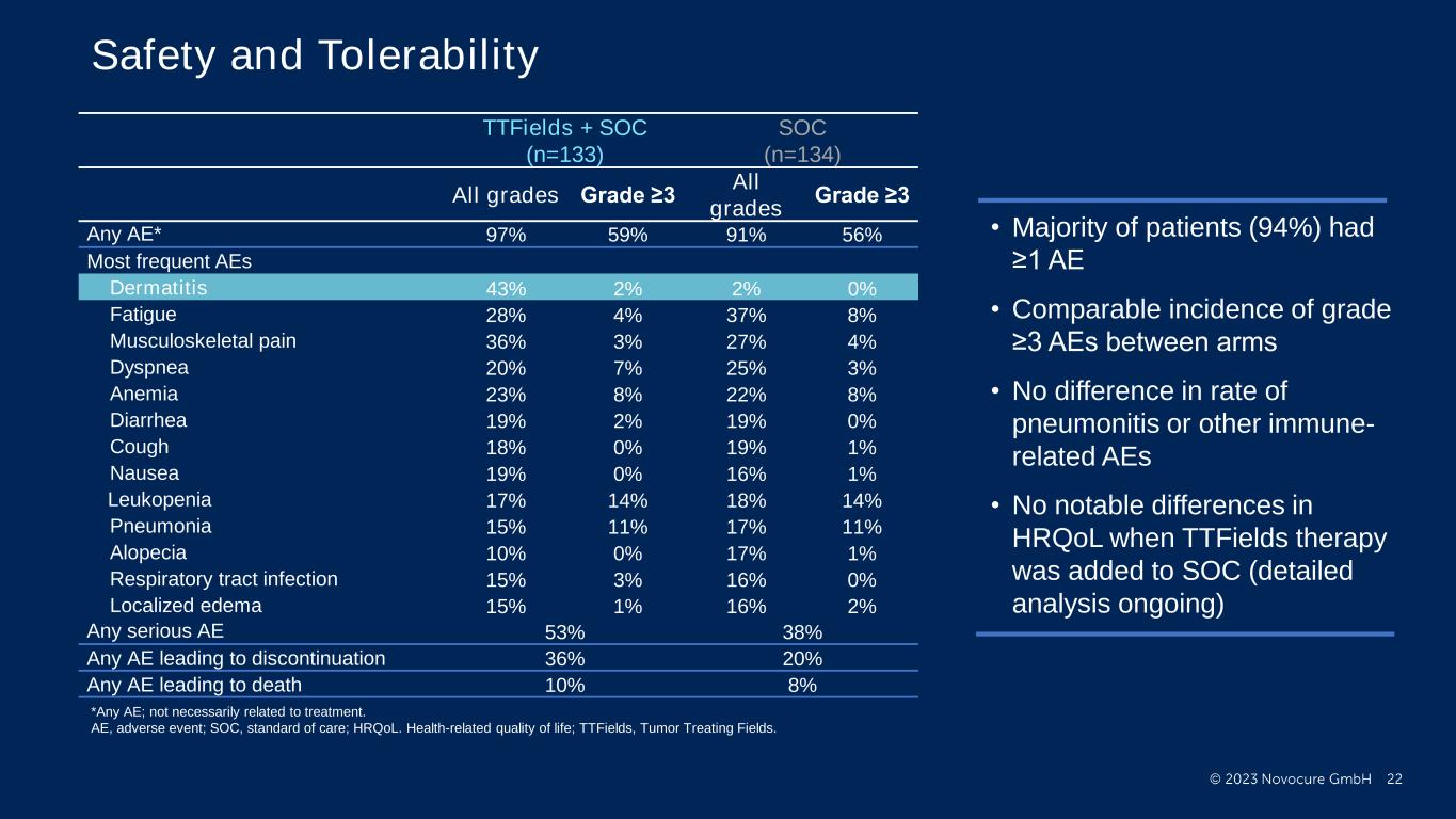 PRESENTED BY: Ticiana Leal, MD, Winship Cancer Institute - Emory University Safety and Tolerability TTFields + SOC (n=133) SOC (n=134) All grades Grade ≥3 All grades Grade ≥3 Any AE* 97% 59% 91% 56% Most frequent AEs Dermatitis 43% 2% 2% 0% Fatigue 28% 4% 37% 8% Musculoskeletal pain 36% 3% 27% 4% Dyspnea 20% 7% 25% 3% Anemia 23% 8% 22% 8% Diarrhea 19% 2% 19% 0% Cough 18% 0% 19% 1% Nausea 19% 0% 16% 1% Leukopenia 17% 14% 18% 14% Pneumonia 15% 11% 17% 11% Alopecia 10% 0% 17% 1% Respiratory tract infection 15% 3% 16% 0% Localized edema 15% 1% 16% 2% Any serious AE 53% 38% Any AE leading to discontinuation 36% 20% Any AE leading to death 10% 8% • Majority of patients (94%) had ≥1 AE • Comparable incidence of grade ≥3 AEs between arms • No difference in rate of pneumonitis or other immune- related AEs • No notable differences in HRQoL when TTFields therapy was added to SOC (detailed analysis ongoing) *Any AE; not necessarily related to treatment. AE, adverse event; SOC, standard of care; HRQoL. Health-related quality of life; TTFields, Tumor Treating Fields.