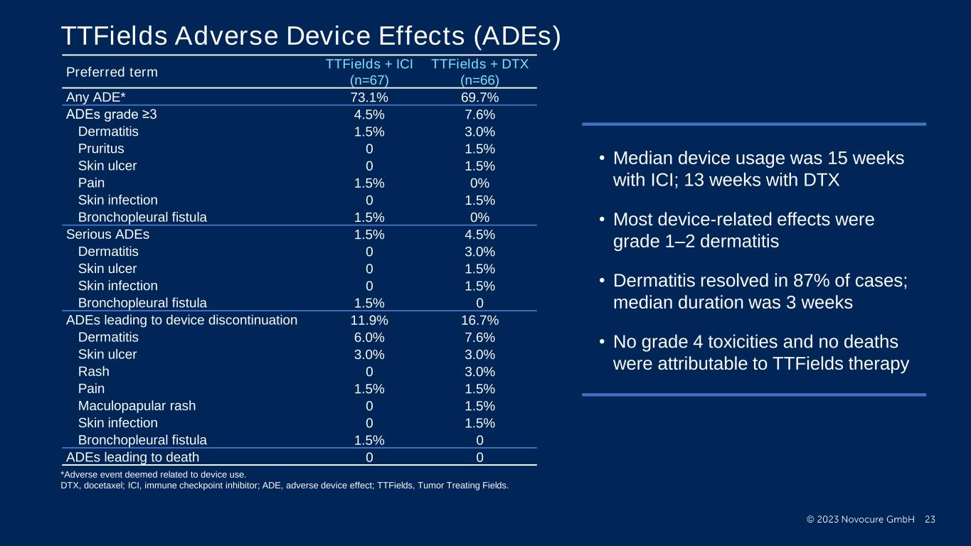 PRESENTED BY: Ticiana Leal, MD, Winship Cancer Institute - Emory University TTFields Adverse Device Effects (ADEs) Preferred term TTFields + ICI (n=67) TTFields + DTX (n=66) Any ADE* 73.1% 69.7% ADEs grade ≥3 4.5% 7.6% Dermatitis 1.5% 3.0% Pruritus 0 1.5% Skin ulcer 0 1.5% Pain 1.5% 0% Skin infection 0 1.5% Bronchopleural fistula 1.5% 0% Serious ADEs 1.5% 4.5% Dermatitis 0 3.0% Skin ulcer 0 1.5% Skin infection 0 1.5% Bronchopleural fistula 1.5% 0 ADEs leading to device discontinuation 11.9% 16.7% Dermatitis 6.0% 7.6% Skin ulcer 3.0% 3.0% Rash 0 3.0% Pain 1.5% 1.5% Maculopapular rash 0 1.5% Skin infection 0 1.5% Bronchopleural fistula 1.5% 0 ADEs leading to death 0 0 • Median device usage was 15 weeks with ICI; 13 weeks with DTX • Most device-related effects were grade 1–2 dermatitis • Dermatitis resolved in 87% of cases; median duration was 3 weeks • No grade 4 toxicities and no deaths were attributable to TTFields therapy *Adverse event deemed related to device use. DTX, docetaxel; ICI, immune checkpoint inhibitor; ADE, adverse device effect; TTFields, Tumor Treating Fields.