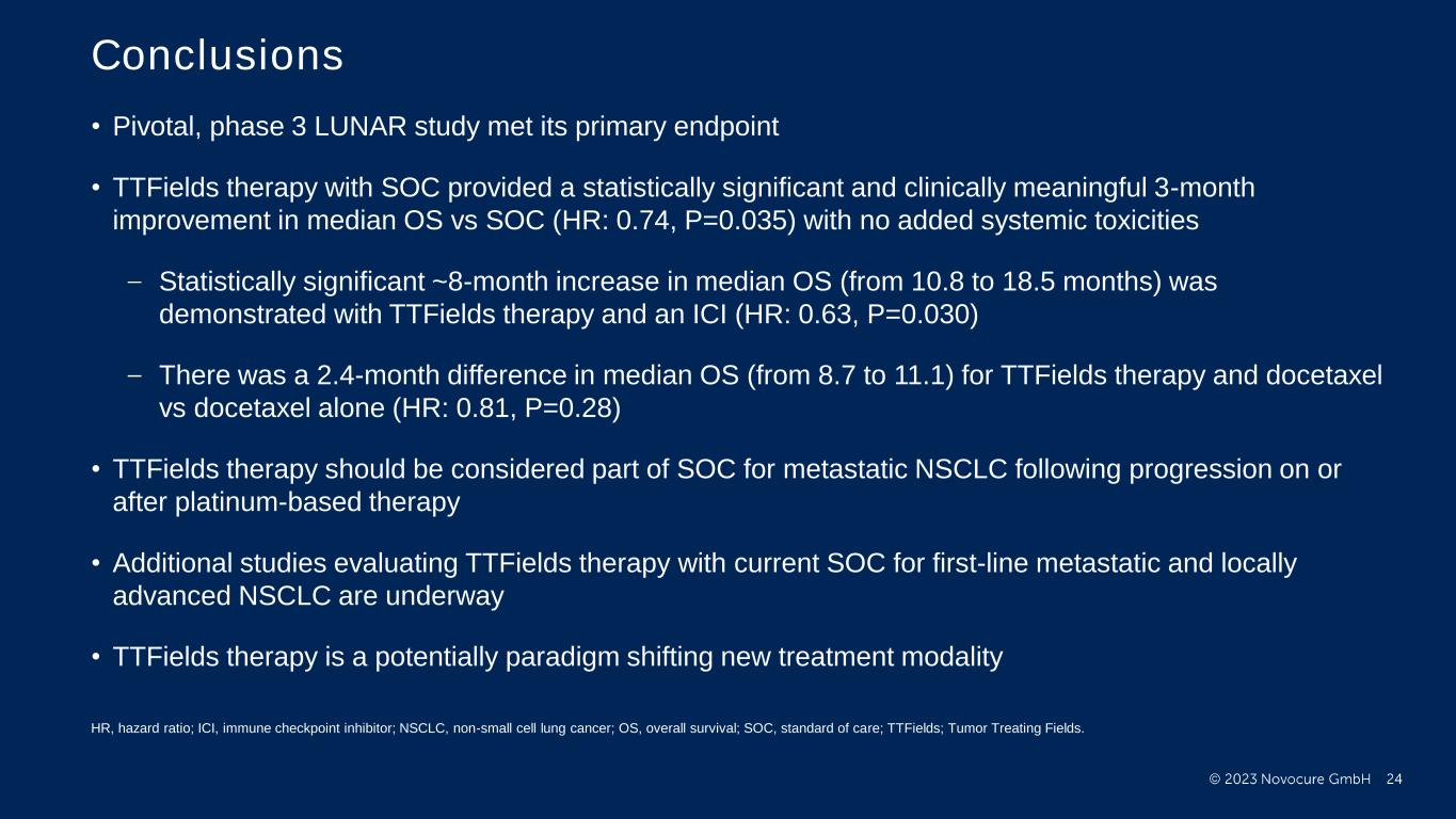 PRESENTED BY: Conclusions • Pivotal, phase 3 LUNAR study met its primary endpoint • TTFields therapy with SOC provided a statistically significant and clinically meaningful 3-month improvement in median OS vs SOC (HR: 0.74, P=0.035) with no added systemic toxicities Statistically significant ~8-month increase in median OS (from 10.8 to 18.5 months) was demonstrated with TTFields therapy and an ICI (HR: 0.63, P=0.030) There was a 2.4-month difference in median OS (from 8.7 to 11.1) for TTFields therapy and docetaxel vs docetaxel alone (HR: 0.81, P=0.28) • TTFields therapy should be considered part of SOC for metastatic NSCLC following progression on or after platinum-based therapy • Additional studies evaluating TTFields therapy with current SOC for first-line metastatic and locally advanced NSCLC are underway • TTFields therapy is a potentially paradigm shifting new treatment modality Ticiana Leal, MD, Winship Cancer Institute - Emory University HR, hazard ratio; ICI, immune checkpoint inhibitor; NSCLC, non-small cell lung cancer; OS, overall survival; SOC, standard of care; TTFields; Tumor Treating Fields.