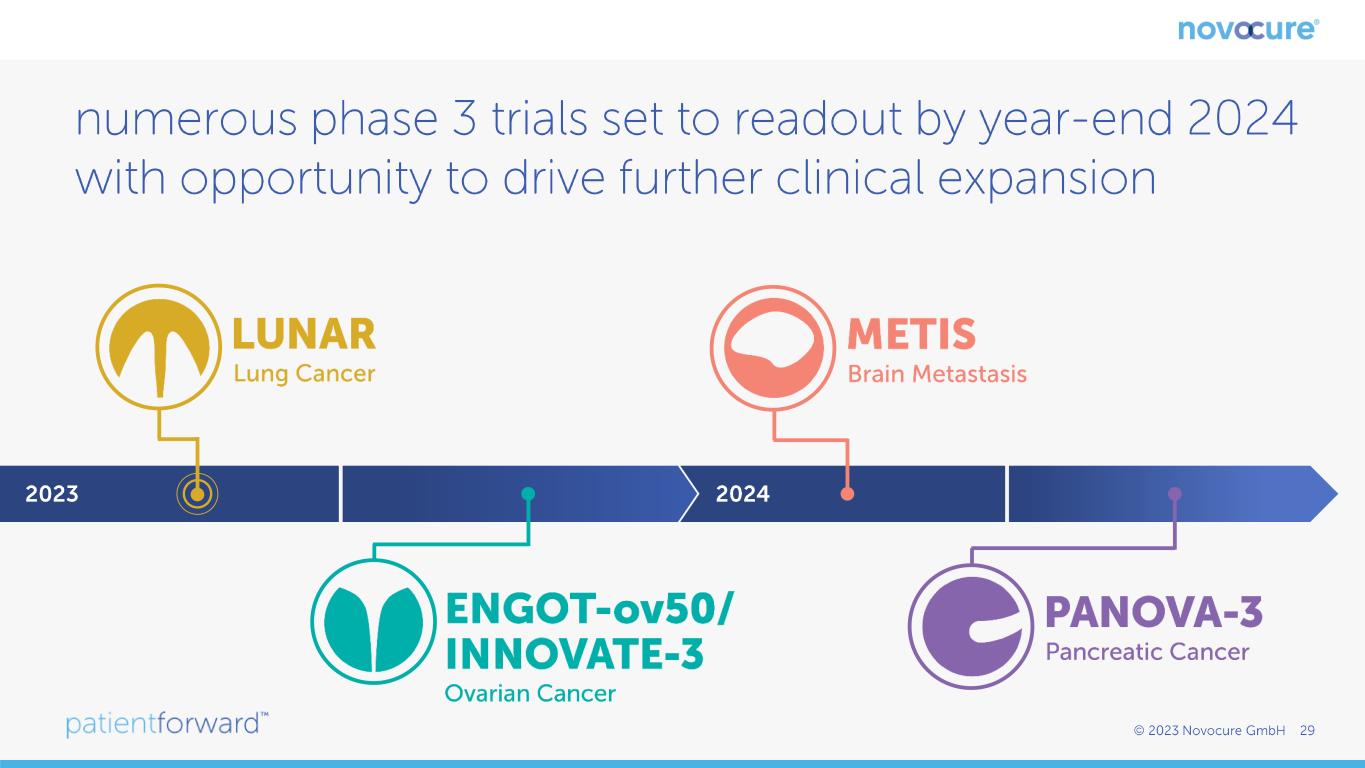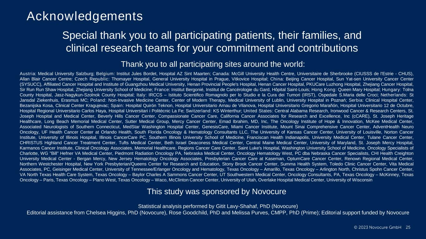 PRESENTED BY: Austria: Medical University Salzburg; Belgium: Institut Jules Bordet, Hospital AZ Sint Maarten; Canada: McGill University Health Centre, Universitaire de Sherbrooke (CIUSSS de l'Estrie - CHUS), Allan Blair Cancer Centre; Czech Republic: Thomayer Hospital, General University Hospital in Prague, Vitkovice Hospital; China: Beijing Cancer Hospital, Sun Yat-sen University Cancer Center (SYSUCC), Affiliated Cancer Hospital and Institute of Guangzhou Medical University, Henan Provincial People's Hospital, Henan Cancer Hospital, PKUCare Luzhong Hospital, Zhejiang Cancer Hospital, Sir Run Run Shaw Hospital, Zhejiang University School of Medicine; France: Institut Bergonié, Institut de Cancérologie du Gard, Hôpital Saint-Louis; Hong Kong: Queen Mary Hospital; Hungary: Tolna County Hospital, Jasz-Nagykun-Szolnok County Hospital; Italy: IRCCS – Istituto Scientifico Romagnolo per lo Studio e la Cura dei Tumori (IRST), Ospedale S.Maria delle Croci; Netherlands: St Jansdal Ziekenhuis, Erasmus MC; Poland: Non-Invasive Medicine Center, Center of Modern Therapy, Medical University of Lublin, University Hospital in Poznań; Serbia: Clinical Hospital Center, Bezanijska Kosa, Clinical Center Kragujevac; Spain: Hospital Quirón Teknon, Hospital Universitario Arnau de Vilanova, Hospital Universitario Gregorio Marañón, Hospital Universitario 12 de Octubre, Hospital Regional Universitario Carlos Haya, Hospital Universitari i Politécnic La Fe; Switzerland: KS Winterthur; United States: Central Alabama Research, Ironwood Cancer & Research Centers, St. Joseph Hospital and Medical Center, Beverly Hills Cancer Center, Compassionate Cancer Care, California Cancer Associates for Research and Excellence, Inc (cCARE), St. Joseph Heritage Healthcare, Long Beach Memorial Medical Center, Sutter Medical Group, Mercy Cancer Center, Emad Ibrahim, MD, Inc, The Oncology Institute of Hope & Innovation, McKee Medical Center, Associated Neurologists of Southern Connecticut, MedStar Washington Hospital Center, GenesisCare, Miami Cancer Institute, Mount Sinai Comprehensive Cancer Center, AdventHealth Neuro Oncology, UF Health Cancer Center at Orlando Health, South Florida Oncology & Hematology Consultants LLC, The University of Kansas Cancer Center, University of Louisville, Norton Cancer Institute, University of Illinois Hospital, Illinois CancerCare PC, Southern Illinois University School of Medicine, Franciscan Health Indianapolis, University Medical Center, Tulane Cancer Center, CHRISTUS Highland Cancer Treatment Center, Tufts Medical Center, Beth Israel Deaconess Medical Center, Central Maine Medical Center, University of Maryland, St. Joseph Mercy Hospital, Karmanos Cancer Institute, Clinical Oncology Associates, Memorial Healthcare, Regions Cancer Care Center, Saint Luke's Hospital, Washington University School of Medicine, Oncology Specialists of Charlotte, WG "Bill" Hefner VA Medical Center, Piedmont Radiation Oncology PA, Nebraska Medical Center, Oncology Hematology West, PC dba Nebraska Cancer Specialists, CHI Health Creighton University Medical Center - Bergan Mercy, New Jersey Hematology Oncology Associates, Presbyterian Cancer Care at Kaseman, OptumCare Cancer Center, Renown Regional Medical Center, Northern Westchester Hospital, New York Presbyterian/Queens Center for Research and Education, Stony Brook Cancer Center, Summa Health System, Toledo Clinic Cancer Center, Vita Medical Associates, PC, Geisinger Medical Center, University of Tennessee/Erlanger Oncology and Hematology, Texas Oncology – Amarillo, Texas Oncology – Arlington North, Christus Spohn Cancer Center, VA North Texas Health Care System, Texas Oncology – Baylor Charles A Sammons Cancer Center, UT Southwestern Medical Center, Oncology Consultants, PA, Texas Oncology – McKinney, Texas Oncology – Paris, Texas Oncology – Plano West, Texas Oncology – Waco, McClinton Cancer Center, University of Utah, Overlake Hospital Medical Center, University of Wisconsin Ticiana Leal, MD, Winship Cancer Institute - Emory University Acknowledgements Special thank you to all participating patients, their families, and clinical research teams for your commitment and contributions Statistical analysis performed by Gitit Lavy-Shahaf, PhD (Novocure) Editorial assistance from Chelsea Higgins, PhD (Novocure), Rose Goodchild, PhD and Melissa Purves, CMPP, PhD (Prime); Editorial support funded by Novocure This study was sponsored by Novocure Thank you to all participating sites around the world: