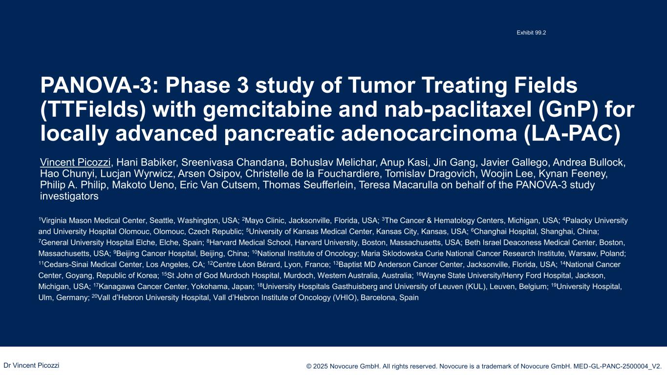 PRESENTED BY: © 2025 Novocure GmbH. All rights reserved. Novocure is a trademark of Novocure GmbH. MED-GL-PANC-2500004_V2. PANOVA-3: Phase 3 study of Tumor Treating Fields (TTFields) with gemcitabine and nab-paclitaxel (GnP) for locally advanced pancreatic adenocarcinoma (LA-PAC) Vincent Picozzi, Hani Babiker, Sreenivasa Chandana, Bohuslav Melichar, Anup Kasi, Jin Gang, Javier Gallego, Andrea Bullock, Hao Chunyi, Lucjan Wyrwicz, Arsen Osipov, Christelle de la Fouchardiere, Tomislav Dragovich, Woojin Lee, Kynan Feeney, Philip A. Philip, Makoto Ueno, Eric Van Cutsem, Thomas Seufferlein, Teresa Macarulla on behalf of the PANOVA-3 study investigators Dr Vincent Picozzi 1Virginia Mason Medical Center, Seattle, Washington, USA; 2Mayo Clinic, Jacksonville, Florida, USA; 3The Cancer & Hematology Centers, Michigan, USA; 4Palacky University and University Hospital Olomouc, Olomouc, Czech Republic; 5University of Kansas Medical Center, Kansas City, Kansas, USA; 6Changhai Hospital, Shanghai, China; 7General University Hospital Elche, Elche, Spain; 8Harvard Medical School, Harvard University, Boston, Massachusetts, USA; Beth Israel Deaconess Medical Center, Boston, Massachusetts, USA; 9Beijing Cancer Hospital, Beijing, China; 10National Institute of Oncology; Maria Sklodowska Curie National Cancer Research Institute, Warsaw, Poland; 11Cedars-Sinai Medical Center, Los Angeles, CA; 12Centre Léon Bérard, Lyon, France; 13Baptist MD Anderson Cancer Center, Jacksonville, Florida, USA; 14National Cancer Center, Goyang, Republic of Korea; 15St John of God Murdoch Hospital, Murdoch, Western Australia, Australia; 16Wayne State University/Henry Ford Hospital, Jackson, Michigan, USA; 17Kanagawa Cancer Center, Yokohama, Japan; 18University Hospitals Gasthuisberg and University of Leuven (KUL), Leuven, Belgium; 19University Hospital, Ulm, Germany; 20Vall d’Hebron University Hospital, Vall d’Hebron Institute of Oncology (VHIO), Barcelona, Spain Exhibit 99.2