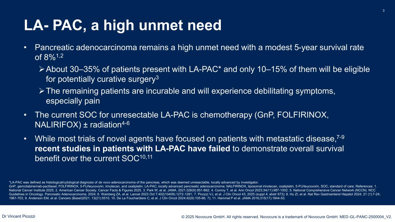 PRESENTED BY: © 2025 Novocure GmbH. All rights reserved. Novocure is a trademark of Novocure GmbH. MED-GL-PANC-2500004_V2. Key Takeaway Points/Conclusions 2 Survival benefit for patients is supported by significantly improved QoL and pain-free survival* compared with GnP alone The only frequently reported TTFields toxicity was localized skin reactions *as the time to a ≥ 20-point increase from baseline on a patient-reported visual analogue scale for pain or death. GnP, gemcitabine/nab-paclitaxel; LA-PAC, locally advanced pancreatic adenocarcinoma; OS, overall survival; TTFields, Tumor Treating Fields. PANOVA-3 is the first phase 3 trial in patients with unresectable LA-PAC to show an OS benefit over gemcitabine/nab-paclitaxel PANOVA-3 establishes TTFields with GnP as a potential new standard paradigm for unresectable LA-PAC Dr Vincent Picozzi
