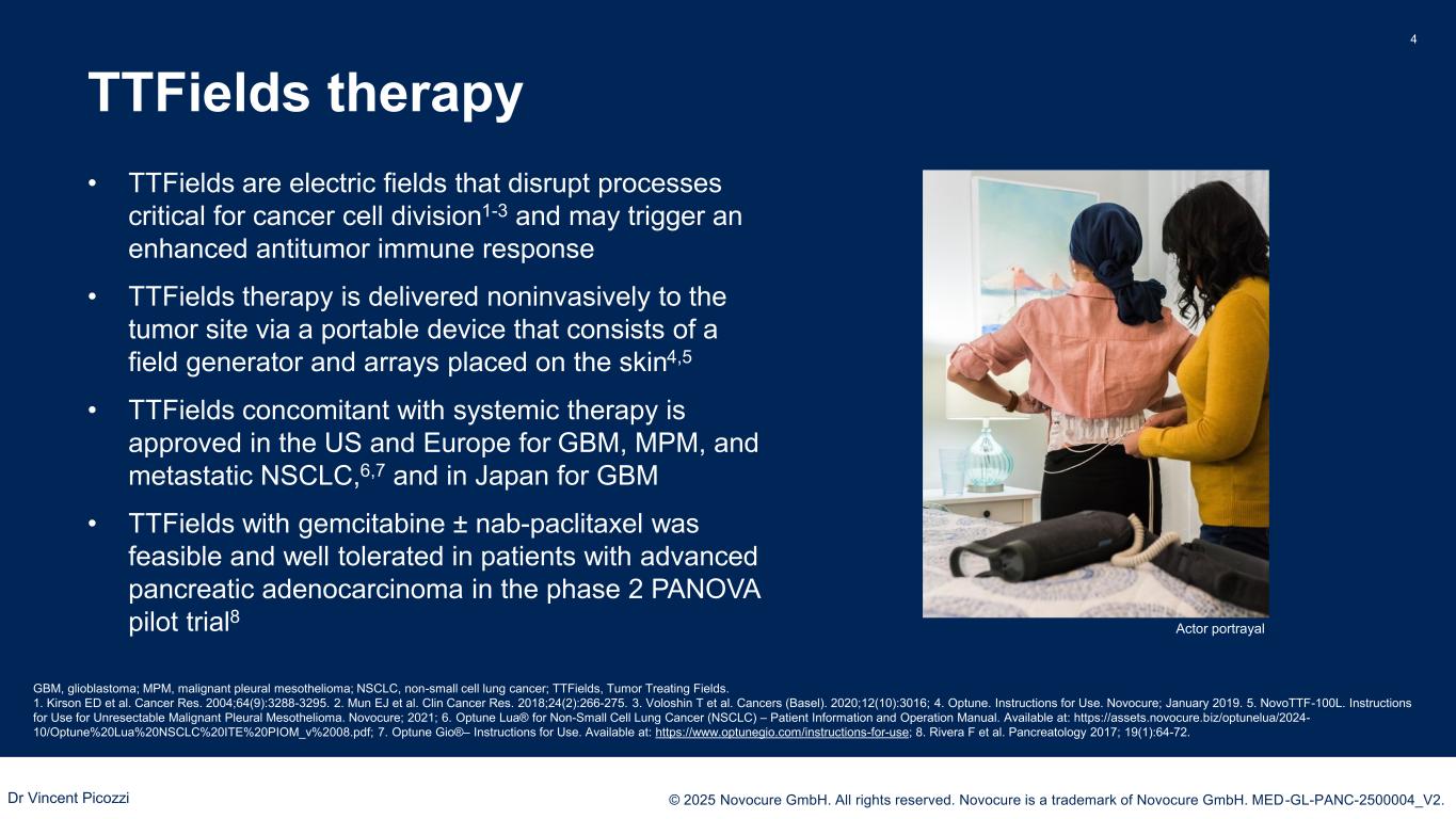 PRESENTED BY: © 2025 Novocure GmbH. All rights reserved. Novocure is a trademark of Novocure GmbH. MED-GL-PANC-2500004_V2. LA- PAC, a high unmet need 3 • Pancreatic adenocarcinoma remains a high unmet need with a modest 5-year survival rate of 8%1,2 ➢About 30–35% of patients present with LA-PAC* and only 10–15% of them will be eligible for potentially curative surgery3 ➢The remaining patients are incurable and will experience debilitating symptoms, especially pain • The current SOC for unresectable LA-PAC is chemotherapy (GnP, FOLFIRINOX, NALIRIFOX) ± radiation4-6 • While most trials of novel agents have focused on patients with metastatic disease,7-9 recent studies in patients with LA-PAC have failed to demonstrate overall survival benefit over the current SOC10,11 *LA-PAC was defined as histological/cytological diagnosis of de novo adenocarcinoma of the pancreas, which was deemed unresectable, locally advanced by investigator. GnP, gemcitabine/nab-paclitaxel; FOLFIRINOX, 5-FU/leucovorin, irinotecan, and oxaliplatin; LA-PAC, locally advanced pancreatic adenocarcinoma; NALFIRINOX, liposomal irinotecan, oxaliplatin, 5-FU/leucovorin, SOC, standard of care; References: 1. National Cancer Institute 2025; 2. American Cancer Society. Cancer Facts & Figures 2025. 3. Park W, et al. JAMA. 2021;326(9):851-862; 4. Conroy T, et al. Ann Oncol 2023;34(11):987-1002; 5. National Comprehensive Cancer Network (NCCN). NCC Guidelines in Oncology. Pancreatic Adenocarcinoma. 2024; 6. Wainberg ZA, et al. Lancet 2023 Oct 7;402(10409):1272-1281; 7. Picozzi VJ, et al. J Clin Oncol 43, 2025 (suppl 4; abstr 673); 8. Hu ZI, et al. Nat Rev Gastroenterol Hepatol 2024; 21 (1):7-24; 1961-703; 9. Anderson EM, et al. Cancers (Basel)2021; 13(21):5510; 10. De La Fouchardiere C, et al. J Clin Oncol 2024;42(9):105-66; 7); 11. Hammel P et al. JAMA 2016;315(17):1844-53. Dr Vincent Picozzi