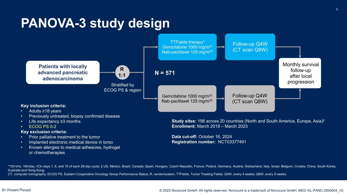 PRESENTED BY: © 2025 Novocure GmbH. All rights reserved. Novocure is a trademark of Novocure GmbH. MED-GL-PANC-2500004_V2. TTFields therapy 4 • TTFields are electric fields that disrupt processes critical for cancer cell division1-3 and may trigger an enhanced antitumor immune response • TTFields therapy is delivered noninvasively ​to the tumor site via a portable device that consists of a field generator and arrays placed on the skin4,5 • TTFields concomitant with systemic therapy is approved in the US and Europe for GBM, MPM, and metastatic NSCLC,6,7 and in Japan for GBM • TTFields with gemcitabine ± nab-paclitaxel was feasible and well tolerated in patients with advanced pancreatic adenocarcinoma in the phase 2 PANOVA pilot trial8 GBM, glioblastoma; MPM, malignant pleural mesothelioma; NSCLC, non-small cell lung cancer; TTFields, Tumor Treating Fields. 1. Kirson ED et al. Cancer Res. 2004;64(9):3288-3295. 2. Mun EJ et al. Clin Cancer Res. 2018;24(2):266-275. 3. Voloshin T et al. Cancers (Basel). 2020;12(10):3016; 4. Optune. Instructions for Use. Novocure; January 2019. 5. NovoTTF-100L. Instructions for Use for Unresectable Malignant Pleural Mesothelioma. Novocure; 2021; 6. Optune Lua® for Non-Small Cell Lung Cancer (NSCLC) – Patient Information and Operation Manual. Available at: https://assets.novocure.biz/optunelua/2024- 10/Optune%20Lua%20NSCLC%20ITE%20PIOM_v%2008.pdf; 7. Optune Gio®– Instructions for Use. Available at: https://www.optunegio.com/instructions-for-use; 8. Rivera F et al. Pancreatology 2017; 19(1):64-72. Actor portrayal Dr Vincent Picozzi