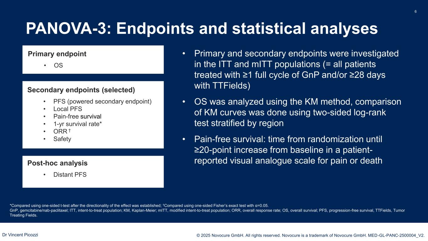 PRESENTED BY: © 2025 Novocure GmbH. All rights reserved. Novocure is a trademark of Novocure GmbH. MED-GL-PANC-2500004_V2. PANOVA-3 study design 5 R 1:1 Gemcitabine 1000 mg/m2† Nab-paclitaxel 125 mg/m2† TTFields therapy* Gemcitabine 1000 mg/m2† Nab-paclitaxel 125 mg/m2† Follow-up Q4W (CT scan Q8W) Follow-up Q4W (CT scan Q8W) Monthly survival follow-up after local progression N = 571 Patients with locally advanced pancreatic adenocarcinoma Stratified by ECOG PS & region *150 kHz, 18h/day; †On days 1, 8, and 15 of each 28-day cycle; ‡ US, Mexico, Brazil, Canada; Spain, Hungary, Czech Republic, France, Poland, Germany, Austria, Switzerland, Italy, Israel, Belgium, Croatia; China, South Korea, Australia and Hong Kong; CT, computer tomography; ECOG PS, Eastern Cooperative Oncology Group Performance Status; R, randomization; TTFields, Tumor Treating Fields; Q4W, every 4 weeks; Q8W, every 8 weeks. Key inclusion criteria: • Adults ≥18 years • Previously untreated, biopsy confirmed disease • Life expectancy ≥3 months • ECOG PS 0-2 Key exclusion criteria: • Prior palliative treatment to the tumor • Implanted electronic medical device in torso • Known allergies to medical adhesives, hydrogel or chemotherapies Study sites: 198 across 20 countries (North and South America, Europe, Asia)‡ Enrollment: March 2018 – March 2023 Data cut-off: October 16, 2024 Registration number: NCT03377491 Dr Vincent Picozzi