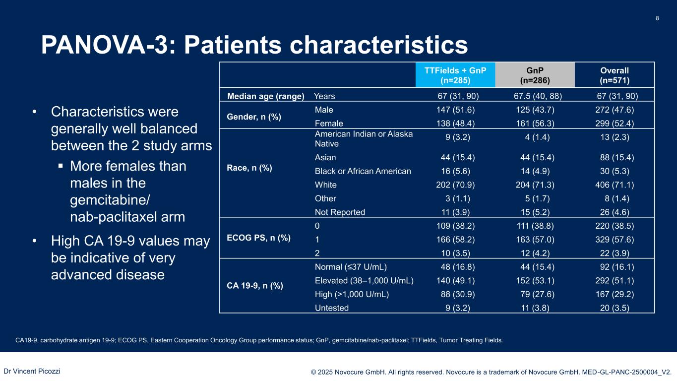 PRESENTED BY: © 2025 Novocure GmbH. All rights reserved. Novocure is a trademark of Novocure GmbH. MED-GL-PANC-2500004_V2. Patient disposition 7 † One full GnP cycle is defined as 3 complete administrations per cycle. GnP, gemcitabine/nab-paclitaxel; ITT, intent-to-treat population; mITT, modified intent-to-treat population; TTFields, Tumor Treating Fields.. Screened N=753 Randomized N=571 TTFields + GnP n=285 GnP n=286 Treated TTFields + GnP n=277 Max. 7 days from randomization Treated GnP n=270 Max. 7 days from randomization Started TTFields + GnP n=274 Started GnP n=273 Treated for ≥28 days with TTFields + ≥1 full cycle of GnP† n=198 Treated with ≥1 full cycle of GnP† n=207 ITT excluded from mITT n=87 Randomized, not treated: n=8 Not treated with TTFields: n=3* ITT excluded from mITT n=79 Randomized, not treated: n= 6 ITT mITT Safety • ITT included all randomized patients regardless of treatment received; mITT included all patients who received at least one complete cycle of treatment (≥28 days with TTFields + ≥1 full cycle of GnP) • The number of discontinuations in both arms during the first 28 days after inclusion was mostly related to disease progression or patients’ decision *3 patients moved to SOC arm Dr Vincent Picozzi