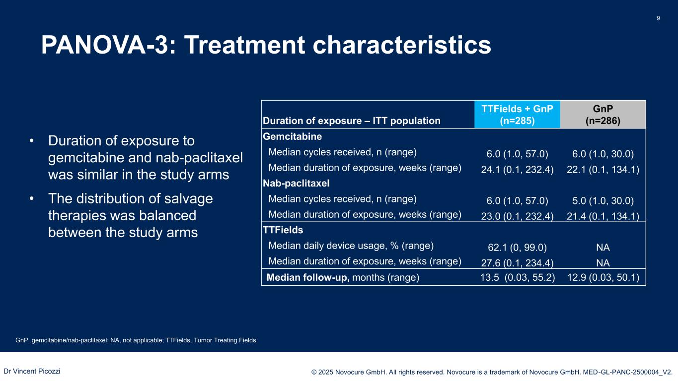 PRESENTED BY: © 2025 Novocure GmbH. All rights reserved. Novocure is a trademark of Novocure GmbH. MED-GL-PANC-2500004_V2. PANOVA-3: Patients characteristics 8 CA19-9, carbohydrate antigen 19-9; ECOG PS, Eastern Cooperation Oncology Group performance status; GnP, gemcitabine/nab-paclitaxel; TTFields, Tumor Treating Fields. TTFields + GnP (n=285) GnP (n=286) Overall (n=571) Median age (range) Years 67 (31, 90) 67.5 (40, 88) 67 (31, 90) Gender, n (%) Male 147 (51.6) 125 (43.7) 272 (47.6) Female 138 (48.4) 161 (56.3) 299 (52.4) Race, n (%) American Indian or Alaska Native 9 (3.2) 4 (1.4) 13 (2.3) Asian 44 (15.4) 44 (15.4) 88 (15.4) Black or African American 16 (5.6) 14 (4.9) 30 (5.3) White 202 (70.9) 204 (71.3) 406 (71.1) Other 3 (1.1) 5 (1.7) 8 (1.4) Not Reported 11 (3.9) 15 (5.2) 26 (4.6) ECOG PS, n (%) 0 109 (38.2) 111 (38.8) 220 (38.5) 1 166 (58.2) 163 (57.0) 329 (57.6) 2 10 (3.5) 12 (4.2) 22 (3.9) CA 19-9, n (%) Normal (≤37 U/mL) 48 (16.8) 44 (15.4) 92 (16.1) Elevated (38–1,000 U/mL) 140 (49.1) 152 (53.1) 292 (51.1) High (>1,000 U/mL) 88 (30.9) 79 (27.6) 167 (29.2) Untested 9 (3.2) 11 (3.8) 20 (3.5) • Characteristics were generally well balanced between the 2 study arms ▪ More females than males in the gemcitabine/ nab-paclitaxel arm • High CA 19-9 values may be indicative of very advanced disease Dr Vincent Picozzi