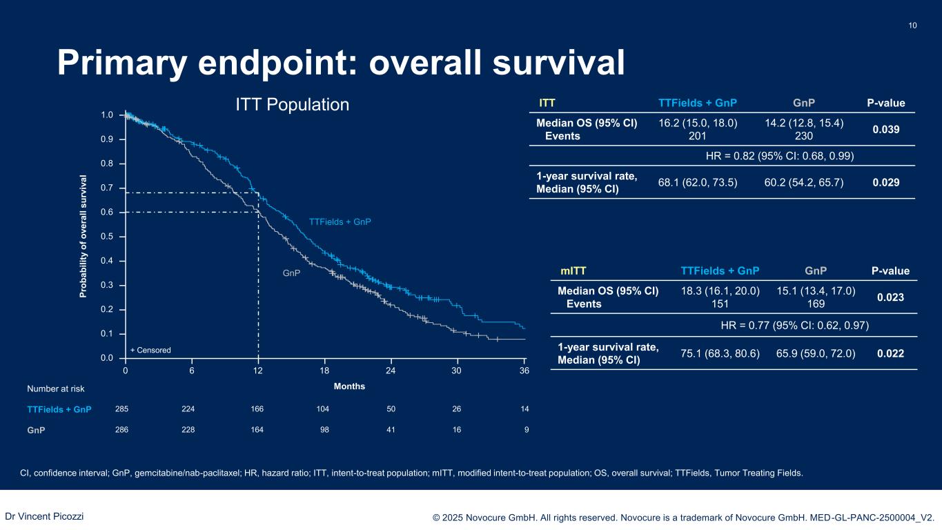 PRESENTED BY: © 2025 Novocure GmbH. All rights reserved. Novocure is a trademark of Novocure GmbH. MED-GL-PANC-2500004_V2. PANOVA-3: Treatment characteristics 9 GnP, gemcitabine/nab-paclitaxel; NA, not applicable; TTFields, Tumor Treating Fields. • Duration of exposure to gemcitabine and nab-paclitaxel was similar in the study arms • The distribution of salvage therapies was balanced between the study arms Duration of exposure – ITT population TTFields + GnP (n=285) GnP (n=286) Gemcitabine Median cycles received, n (range) 6.0 (1.0, 57.0) 6.0 (1.0, 30.0) Median duration of exposure, weeks (range) 24.1 (0.1, 232.4) 22.1 (0.1, 134.1) Nab-paclitaxel Median cycles received, n (range) 6.0 (1.0, 57.0) 5.0 (1.0, 30.0) Median duration of exposure, weeks (range) 23.0 (0.1, 232.4) 21.4 (0.1, 134.1) TTFields Median daily device usage, % (range) 62.1 (0, 99.0) NA Median duration of exposure, weeks (range) 27.6 (0.1, 234.4) NA Median follow-up, months (range) 13.5 (0.03, 55.2) 12.9 (0.03, 50.1) Dr Vincent Picozzi