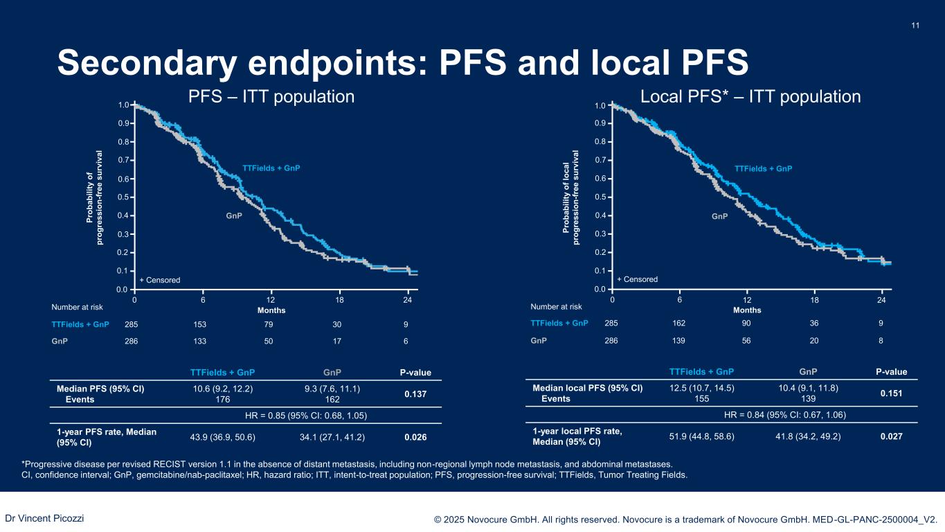 PRESENTED BY: © 2025 Novocure GmbH. All rights reserved. Novocure is a trademark of Novocure GmbH. MED-GL-PANC-2500004_V2. Primary endpoint: overall survival ITT TTFields + GnP GnP P-value Median OS (95% CI) Events 16.2 (15.0, 18.0) 201 14.2 (12.8, 15.4) 230 0.039 HR = 0.82 (95% CI: 0.68, 0.99) 1-year survival rate, Median (95% CI) 68.1 (62.0, 73.5) 60.2 (54.2, 65.7) 0.029 10 ITT Population CI, confidence interval; GnP, gemcitabine/nab-paclitaxel; HR, hazard ratio; ITT, intent-to-treat population; mITT, modified intent-to-treat population; OS, overall survival; TTFields, Tumor Treating Fields. 1.0 0.9 0.8 0.7 0.6 0.5 0.4 0.3 0.2 0.1 0.0 0 2412 30186 14285 50166224 26104 9286 41164 1698228 P ro b a b il it y o f o v e ra ll s u rv iv a l MonthsNumber at risk TTFields + GnP GnP GnP TTFields + GnP + Censored 36 mITT TTFields + GnP GnP P-value Median OS (95% CI) Events 18.3 (16.1, 20.0) 151 15.1 (13.4, 17.0) 169 0.023 HR = 0.77 (95% CI: 0.62, 0.97) 1-year survival rate, Median (95% CI) 75.1 (68.3, 80.6) 65.9 (59.0, 72.0) 0.022 Dr Vincent Picozzi