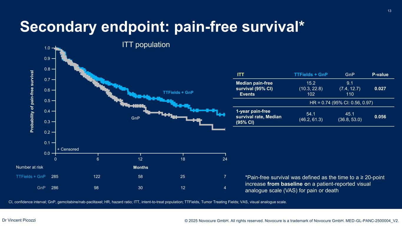 PRESENTED BY: © 2025 Novocure GmbH. All rights reserved. Novocure is a trademark of Novocure GmbH. MED-GL-PANC-2500004_V2. Post-hoc analysis: Distant PFS* 12 *Defined as progressive disease per revised RECIST version 1.1 in the absence of local progression. CI, confidence interval; GnP, gemcitabine/nab-paclitaxel; HR, hazard ratio; ITT, intent-to-treat population; PFS, progression-free survival; TTFields, Tumor Treating Fields. ITT TTFields + GnP GnP P-value Median distant PFS (95% CI) Events 13.9 (12.2, 16.8) 113 11.5 (10.4, 12.9) 119 0.022 HR = 0.74 (95% CI: 0.57, 0.96) 1-year distant PFS rate, Median (95% CI) 58.5 (50.7, 65.4) 47.6 (39.6, 55.2) 0.024 ITT population1.0 0.9 0.8 0.7 0.6 0.5 0.4 0.3 0.2 0.1 0.0 0 2418126 11285 3386164 6286 1955138 Number at risk TTFields + GnP GnP Months + Censored GnP TTFields + GnP P ro b a b il it y o f d is ta n t P F S Dr Vincent Picozzi