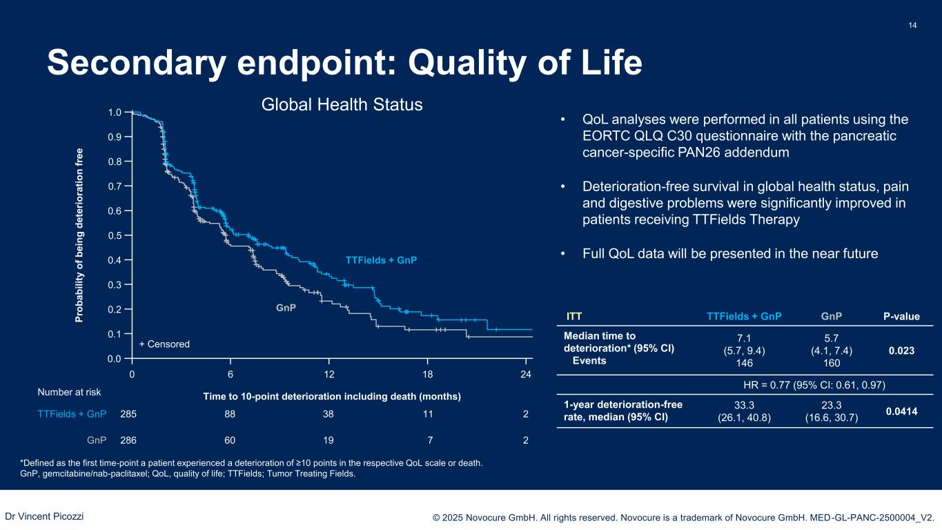 PRESENTED BY: © 2025 Novocure GmbH. All rights reserved. Novocure is a trademark of Novocure GmbH. MED-GL-PANC-2500004_V2. Secondary endpoint: pain-free survival* 13 CI, confidence interval; GnP, gemcitabine/nab-paclitaxel; HR, hazard ratio; ITT, intent-to-treat population; TTFields, Tumor Treating Fields; VAS, visual analogue scale. *Pain-free survival was defined as the time to a ≥ 20-point increase from baseline on a patient-reported visual analogue scale (VAS) for pain or death ITT population 1.0 0.9 0.8 0.7 0.6 0.5 0.4 0.3 0.2 0.1 0.0 0 12 186 285 758122 25 286 430 1298 TTFields + GnP GnP + Censored Number at risk TTFields + GnP GnP P ro b a b il it y o f p a in -f re e s u rv iv a l Months 24 ITT TTFields + GnP GnP P-value Median pain-free survival (95% CI) Events 15.2 (10.3, 22.8) 102 9.1 (7.4, 12.7) 110 0.027 HR = 0.74 (95% CI: 0.56, 0.97) 1-year pain-free survival rate, Median (95% CI) 54.1 (46.2, 61.3) 45.1 (36.8, 53.0) 0.056 Dr Vincent Picozzi