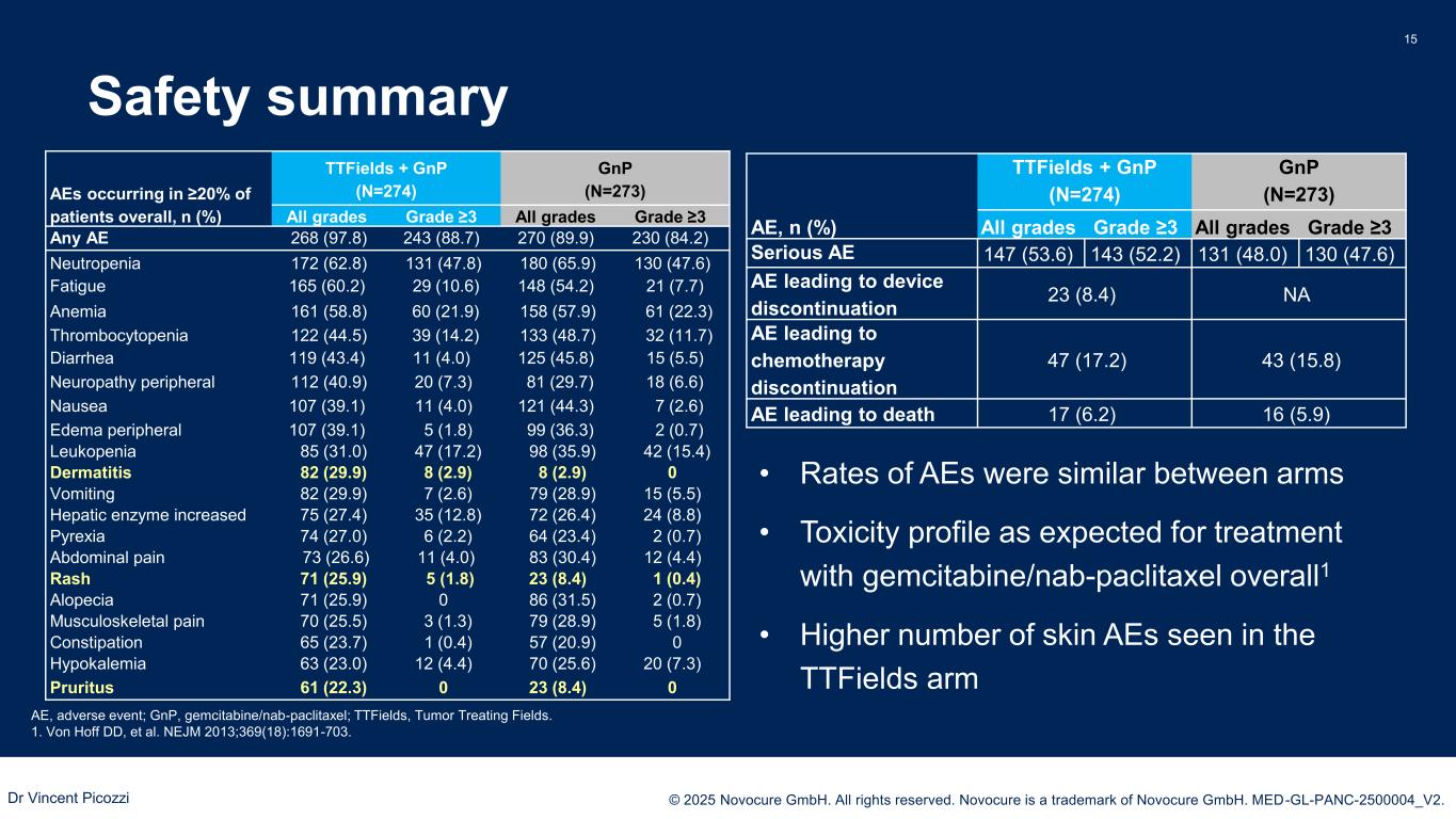 PRESENTED BY: © 2025 Novocure GmbH. All rights reserved. Novocure is a trademark of Novocure GmbH. MED-GL-PANC-2500004_V2. 14 *Defined as the first time-point a patient experienced a deterioration of ≥10 points in the respective QoL scale or death. GnP, gemcitabine/nab-paclitaxel; QoL, quality of life; TTFields; Tumor Treating Fields. ITT TTFields + GnP GnP P-value Median time to deterioration* (95% CI) Events 7.1 (5.7, 9.4) 146 5.7 (4.1, 7.4) 160 0.023 HR = 0.77 (95% CI: 0.61, 0.97) 1-year deterioration-free rate, median (95% CI) 33.3 (26.1, 40.8) 23.3 (16.6, 30.7) 0.0414 • QoL analyses were performed in all patients using the EORTC QLQ C30 questionnaire with the pancreatic cancer-specific PAN26 addendum • Deterioration-free survival in global health status, pain and digestive problems were significantly improved in patients receiving TTFields Therapy • Full QoL data will be presented in the near future + Censored 0 12 186 Time to 10-point deterioration including death (months) 24 1.0 0.9 0.8 0.7 0.6 0.5 0.4 0.3 0.2 0.1 0.0 P ro b a b il it y o f b e in g d e te ri o ra ti o n f re e TTFields + GnP GnP 285 23888 11 286 219 760 Number at risk TTFields + GnP GnP Secondary endpoint: Quality of Life Global Health Status Dr Vincent Picozzi