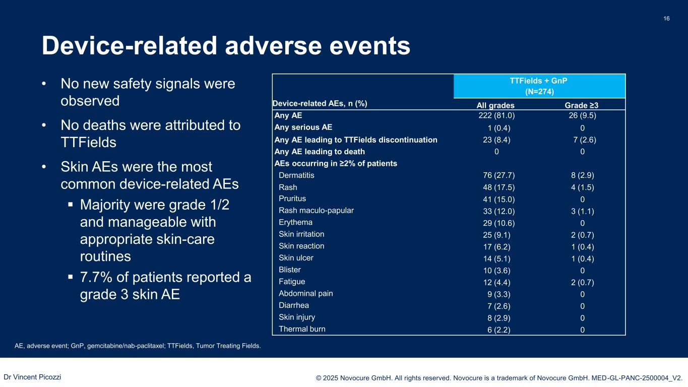 PRESENTED BY: © 2025 Novocure GmbH. All rights reserved. Novocure is a trademark of Novocure GmbH. MED-GL-PANC-2500004_V2. Safety summary 15 AE, adverse event; GnP, gemcitabine/nab-paclitaxel; TTFields, Tumor Treating Fields. 1. Von Hoff DD, et al. NEJM 2013;369(18):1691-703. • Rates of AEs were similar between arms • Toxicity profile as expected for treatment with gemcitabine/nab-paclitaxel overall1 • Higher number of skin AEs seen in the TTFields arm AE, n (%) TTFields + GnP (N=274) GnP (N=273) All grades Grade ≥3 All grades Grade ≥3 Serious AE 147 (53.6) 143 (52.2) 131 (48.0) 130 (47.6) AE leading to device discontinuation 23 (8.4) NA AE leading to chemotherapy discontinuation 47 (17.2) 43 (15.8) AE leading to death 17 (6.2) 16 (5.9) AEs occurring in ≥20% of patients overall, n (%) TTFields + GnP (N=274) GnP (N=273) All grades Grade ≥3 All grades Grade ≥3 Any AE 268 (97.8) 243 (88.7) 270 (89.9) 230 (84.2) Neutropenia 172 (62.8) 131 (47.8) 180 (65.9) 130 (47.6) Fatigue 165 (60.2) 29 (10.6) 148 (54.2) 21 (7.7) Anemia 161 (58.8) 60 (21.9) 158 (57.9) 61 (22.3) Thrombocytopenia 122 (44.5) 39 (14.2) 133 (48.7) 32 (11.7) Diarrhea 119 (43.4) 11 (4.0) 125 (45.8) 15 (5.5) Neuropathy peripheral 112 (40.9) 20 (7.3) 81 (29.7) 18 (6.6) Nausea 107 (39.1) 11 (4.0) 121 (44.3) 7 (2.6) Edema peripheral 107 (39.1) 5 (1.8) 99 (36.3) 2 (0.7) Leukopenia 85 (31.0) 47 (17.2) 98 (35.9) 42 (15.4) Dermatitis 82 (29.9) 8 (2.9) 8 (2.9) 0 Vomiting 82 (29.9) 7 (2.6) 79 (28.9) 15 (5.5) Hepatic enzyme increased 75 (27.4) 35 (12.8) 72 (26.4) 24 (8.8) Pyrexia 74 (27.0) 6 (2.2) 64 (23.4) 2 (0.7) Abdominal pain 73 (26.6) 11 (4.0) 83 (30.4) 12 (4.4) Rash 71 (25.9) 5 (1.8) 23 (8.4) 1 (0.4) Alopecia 71 (25.9) 0 86 (31.5) 2 (0.7) Musculoskeletal pain 70 (25.5) 3 (1.3) 79 (28.9) 5 (1.8) Constipation 65 (23.7) 1 (0.4) 57 (20.9) 0 Hypokalemia 63 (23.0) 12 (4.4) 70 (25.6) 20 (7.3) Pruritus 61 (22.3) 0 23 (8.4) 0 Dr Vincent Picozzi