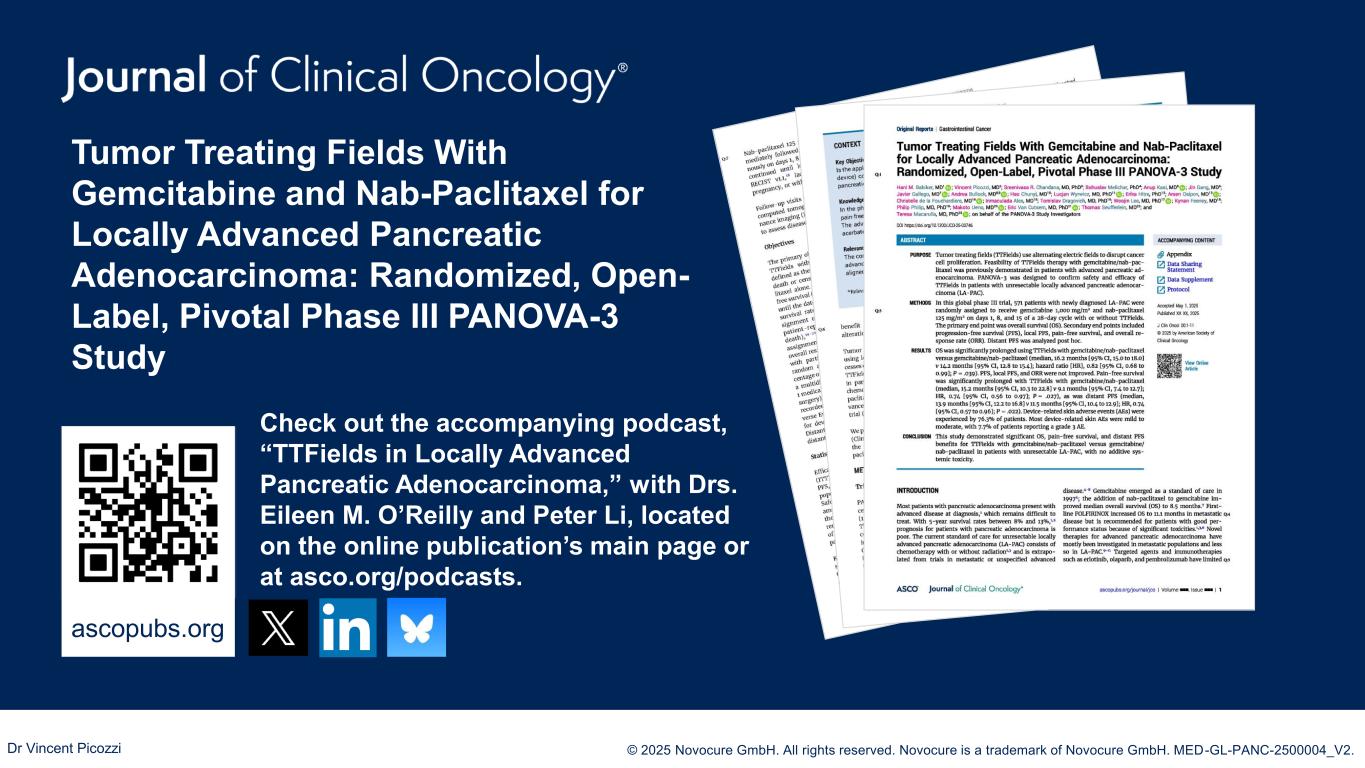 PRESENTED BY: © 2025 Novocure GmbH. All rights reserved. Novocure is a trademark of Novocure GmbH. MED-GL-PANC-2500004_V2. Tumor Treating Fields With Gemcitabine and Nab-Paclitaxel for Locally Advanced Pancreatic Adenocarcinoma: Randomized, Open- Label, Pivotal Phase III PANOVA-3 Study ascopubs.org QR code here Check out the accompanying podcast, “TTFields in Locally Advanced Pancreatic Adenocarcinoma,” with Drs. Eileen M. O’Reilly and Peter Li, located on the online publication’s main page or at asco.org/podcasts. Dr Vincent Picozzi