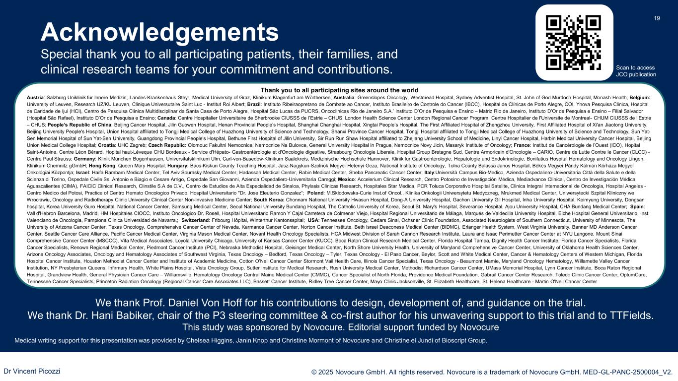 PRESENTED BY: © 2025 Novocure GmbH. All rights reserved. Novocure is a trademark of Novocure GmbH. MED-GL-PANC-2500004_V2. 19 Special thank you to all participating patients, their families, and clinical research teams for your commitment and contributions. Acknowledgements Medical writing support for this presentation was provided by Chelsea Higgins, Janin Knop and Christine Mormont of Novocure and Christine el Jundi of Bioscript Group. We thank Prof. Daniel Von Hoff for his contributions to design, development of, and guidance on the trial. We thank Dr. Hani Babiker, chair of the P3 steering committee & co-first author for his unwavering support to this trial and to TTFields. This study was sponsored by Novocure. Editorial support funded by Novocure Thank you to all participating sites around the world Austria: Salzburg Uniklinik fur Innere Medizin, Landes-Krankenhaus Steyr, Medical University of Graz, Klinikum Klagenfurt am Wörthersee; Australia: Greenslopes Oncology, Westmead Hospital, Sydney Adventist Hospital, St. John of God Murdoch Hospital, Monash Health; Belgium: University of Leuven, Research UZ/KU Leuven, Clinique Universutaire Saint Luc - Institut Roi Albert; Brazil: Instituto Ribeiraopretano de Combate ao Cancer, Instituto Brasileiro de Controle do Cancer (IBCC), Hospital de Clínicas de Porto Alegre, COI, Ynova Pesquisa Clinica, Hospital de Caridade de Ijui (HCI), Centro de Pesquisa Clínica Multidisciplinar da Santa Casa de Porto Alegre, Hospital São Lucas da PUCRS, Oncoclinicas Rio de Janeiro S.A.’ Instituto D’Or de Pesquisa e Ensino – Matriz Rio de Janeiro, Instituto D’Or de Pesquisa e Ensino – Filial Salvador (Hospital São Rafael), Instituto D’Or de Pesquisa e Ensino; Canada: Centre Hospitalier Universitaire de Sherbrooke CIUSSS de l’Estrie – CHUS, London Health Science Center London Regional Cancer Program, Centre Hospitalier de l'Universite de Montreal- CHUM CIUSSS de l’Estrie – CHUS; People’s Republic of China: Beijing Cancer Hospital, Jilin Guowen Hospital, Henan Provincial People’s Hospital, Shanghai Changhai Hospital, Xingtai People’s Hospital, The First Affiliated Hospital of Zhengzhou University, First Affiliated Hospital of Xi'an Jiaotong University, Beijing University People's Hospital, Union Hospital affiliated to Tongji Medical College of Huazhong University of Science and Technology, Shanxi Province Cancer Hospital, Tongji Hospital affiliated to Tongji Medical College of Huazhong University of Science and Technology, Sun Yat- Sen Memorial Hospital of Sun Yat-Sen University, Guangdong Provincial People's Hospital, Bethune First Hospital of Jilin University, Sir Run Run Shaw Hospital affiliated to Zhejiang University School of Medicine, Linyi Cancer Hospital, Harbin Medical University Cancer Hospital, Beijing Union Medical College Hospital; Croatia: UHC Zagreb; Czech Republic: Olomouc Fakultni Nemocnice, Nemocnice Na Bulovce, General University Hospital in Prague, Nemocnice Novy Jicin, Masaryk Institute of Oncology; France: Institut de Cancérologie de l’Ouest (ICO), Hopital Saint-Antoine, Centre Léon Bérard, Hopital haut-Léveque CHU Bordeaux - Service d'Hépato- Gastroentérologie et d'Oncologie digestive, Strasbourg Oncologie Liberale, Hospital Group Bretagne Sud, Centre Armoricain d'Oncologie – CARIO, Centre de Lutte Contre le Cancer (CLCC) - Centre Paul Strauss; Germany: Klinik München Bogenhausen, Universitätsklinikum Ulm, Carl-von-Basedow-Klinikum Saalekreis, Medizinische Hochschule Hannover, Klinik fur Gastroenterologie, Hepatologie und Endokrinologie, Bonifatius Hospital Hematology and Oncology Lingen, Klinikum Chemnitz gGmbH; Hong Kong: Queen Mary Hospital; Hungary: Bacs-Kiskun County Teaching Hospital, Jasz-Nagykun-Szolnok Megyei Hetenyi Geza, National Institute of Oncology, Tolna County Balassa Janos Hospital, Békés Megyei Pándy Kálmán Kórháza Megyei Onkológiai Központja; Israel: Haifa Rambam Medical Center, Tel Aviv Sourasky Medical Center, Hadassah Medical Center, Rabin Medical Center, Sheba Pancreatic Cancer Center; Italy:Università Campus Bio-Medico, Azienda Ospedaliero-Universitaria Città della Salute e della Scienza di Torino, Ospedale Civile Ss. Antonio e Biagio e Cesare Arrigo, Ospedale San Giovanni, Azienda Ospedaliero-Universitaria Careggi; Mexico: Accelerium Clinical Research, Centro Potosino de Investigación Médica, Mediadvance Clinical, Centro de Investigación Médica Aguascalientes (CIMA), FAICIC Clinical Research, Clinstile S.A de C.V., Centro de Estudios de Alta Especialidad de Sinaloa, Phylasis Clinicas Research, Hospitales Star Medica, PCR Toluca Corporativo Hospital Satelite, Clinica Integral Internacional de Oncologia, Hospital Angeles - Centro Medico del Potosi, Practice of Centro Hemato Oncologico Privado, Hospital Universitario "Dr. Jose Eleuterio Gonzalez“; Poland: M.Sklodowska-Curie Inst.of Oncol., Klinika Onkologii Uniwersytetu Medyczneg, Mrukmed Medical Center, Uniwersytecki Szpital Kliniczny we Wrocławiu, Oncology and Radiotherapy Clinic University Clinical Center Non-Invasive Medicine Center; South Korea: Chonnam National University Hwasun Hospital, Dong-A University Hospital, Gachon University Gil Hospital, Inha University Hospital, Keimyung University, Dongsan hospital, Korea University Guro Hospital, National Cancer Center, Samsung Medical Center, Seoul National University Bundang Hospital, The Catholic University of Korea, Seoul St. Mary's Hospital, Severance Hospital, Ajou University Hospital, CHA Bundang Medical Center; Spain: Vall d'Hebron Barcelona, Madrid, HM Hospitales CIOCC, Instituto Oncologico Dr. Rosell, Hospital Universitario Ramon Y Cajal Carretera de Colmenar Viejo, Hospital Regional Universitario de Málaga, Marqués de Valdecilla University Hospital, Elche Hospital General Universitario, Inst. Valenciano de Oncologia, Pamplona Clinica Universidad de Navarra,; Switzerland: Fribourg Hôpital, Winterthur Kantonsspital; USA: Tennessee Oncology, Ceda
