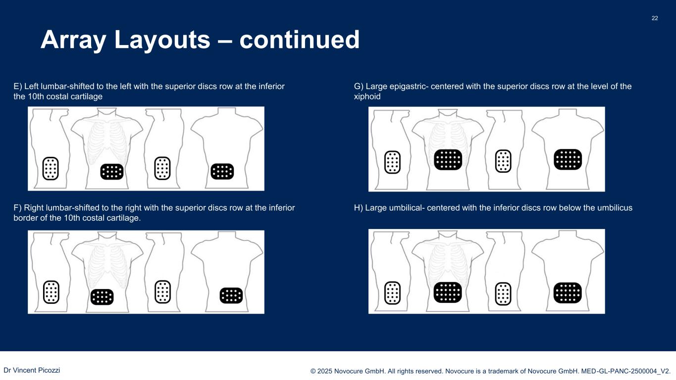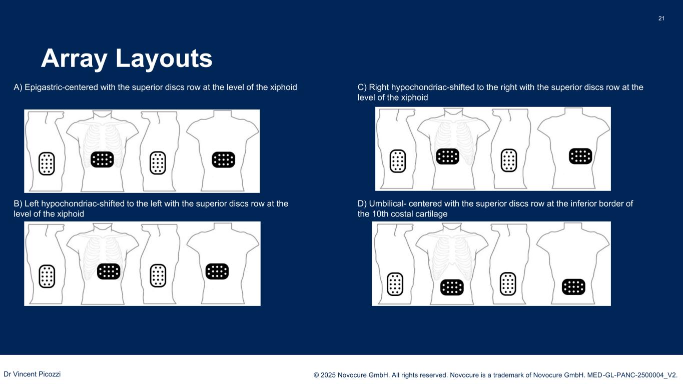 PRESENTED BY: © 2025 Novocure GmbH. All rights reserved. Novocure is a trademark of Novocure GmbH. MED-GL-PANC-2500004_V2. Array Layouts 21 A) Epigastric-centered with the superior discs row at the level of the xiphoid B) Left hypochondriac-shifted to the left with the superior discs row at the level of the xiphoid C) Right hypochondriac-shifted to the right with the superior discs row at the level of the xiphoid D) Umbilical- centered with the superior discs row at the inferior border of the 10th costal cartilage Dr Vincent Picozzi