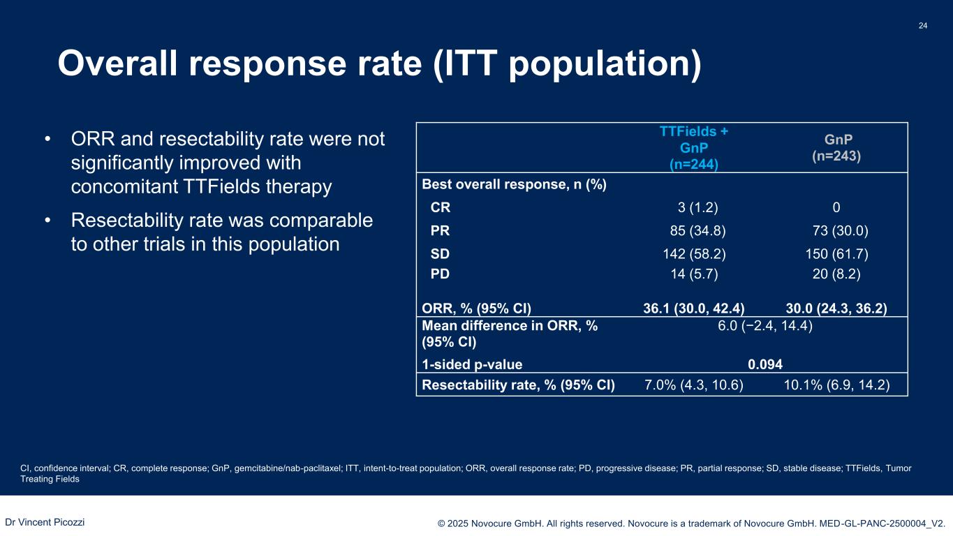 PRESENTED BY: © 2025 Novocure GmbH. All rights reserved. Novocure is a trademark of Novocure GmbH. MED-GL-PANC-2500004_V2. Secondary Endpoints in the mITT population 23 mITT TTFields + GnP GnP P-value Median PFS (95% CI) Events 11.2 (9.4, 13.1) 136 10.7 (9.1, 11.5) 121 0.183 HR = 0.84 (95% CI: 0.66, 1.08) 1-year PFS rate, median (95% CI) 48.5 (40.5, 56.0) 38.7 (30.5, 46.8) 0.044 PFS Local PFS mITT TTFields + GnP GnP P-value Median local PFS (95% CI) Events 12.9 (11.3, 15.1) 117 11.5 (9.8, 13.1) 101 0.194 HR = 0.84 (0.64. 1.10) 1-year local PFS rate, median (95% CI) 51.9 (44.8, 58.6) 41.8 (34.2, 49.2) 0.027 mITT TTFields + GnP GnP P-value Median distant PFS (95% CI) Events 15.6 (13.1, 18.4) 81 12.2 (11.3, 13.7) 88 0.017 HR = 0.69 (95% CI: 0.51, 0.94) 1-year distant PFS rate, median (95% CI) 64.4 (55.7, 71.8) 52.6 (43.4, 60.9) 0.013 Distant PFS (post-hoc) mITT TTFields + GnP GnP P-value Median pain-free survival (95% CI) Events 16.6 (11.0, 29.9) 79 9.2 (7.6, 12.9) 86 0.019 HR = 0.69 (95% CI: 0.50, 0.94) 1-year pain-free survival rate, Median (95% CI) 56.8 (48.1, 64.7) 45.8 (36.6, 54.6) 0.040 Pain-free survival Dr Vincent Picozzi
