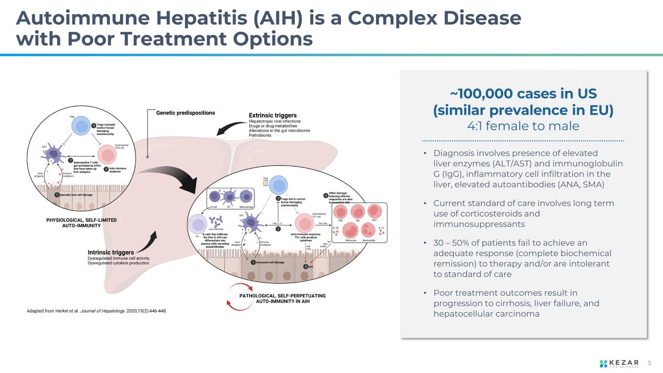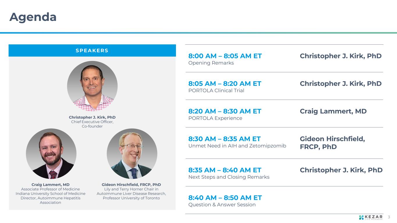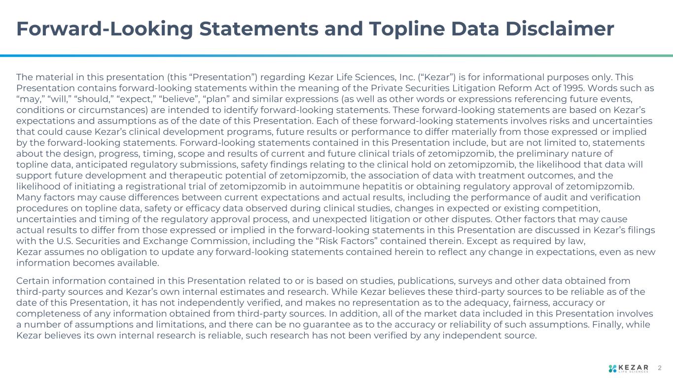 Forward-Looking Statements and Topline Data Disclaimer The material in this presentation (this “Presentation”) regarding Kezar Life Sciences, Inc. (“Kezar”) is for informational purposes only. This Presentation contains forward-looking statements within the meaning of the Private Securities Litigation Reform Act of 1995. Words such as “may,” “will,” “should,” “expect,” “believe”, “plan” and similar expressions (as well as other words or expressions referencing future events, conditions or circumstances) are intended to identify forward-looking statements. These forward-looking statements are based on Kezar’s expectations and assumptions as of the date of this Presentation. Each of these forward-looking statements involves risks and uncertainties that could cause Kezar’s clinical development programs, future results or performance to differ materially from those expressed or implied by the forward-looking statements. Forward-looking statements contained in this Presentation include, but are not limited to, statements about the design, progress, timing, scope and results of current and future clinical trials of zetomipzomib, the preliminary nature of topline data, anticipated regulatory submissions, safety findings relating to the clinical hold on zetomipzomib, the likelihood that data will support future development and therapeutic potential of zetomipzomib, the association of data with treatment outcomes, and the likelihood of initiating a registrational trial of zetomipzomib in autoimmune hepatitis or obtaining regulatory approval of zetomipzomib. Many factors may cause differences between current expectations and actual results, including the performance of audit and verification procedures on topline data, safety or efficacy data observed during clinical studies, changes in expected or existing competition, uncertainties and timing of the regulatory approval process, and unexpected litigation or other disputes. Other factors that may cause actual results to differ from those expressed or implied in the forward-looking statements in this Presentation are discussed in Kezar’s filings with the U.S. Securities and Exchange Commission, including the “Risk Factors” contained therein. Except as required by law, Kezar assumes no obligation to update any forward-looking statements contained herein to reflect any change in expectations, even as new information becomes available.​ Certain information contained in this Presentation related to or is based on studies, publications, surveys and other data obtained from third-party sources and Kezar’s own internal estimates and research. While Kezar believes these third-party sources to be reliable as of the date of this Presentation, it has not independently verified, and makes no representation as to the adequacy, fairness, accuracy or completeness of any information obtained from third-party sources. In addition, all of the market data included in this Presentation involves a number of assumptions and limitations, and there can be no guarantee as to the accuracy or reliability of such assumptions. Finally, while Kezar believes its own internal research is reliable, such research has not been verified by any independent source. 2