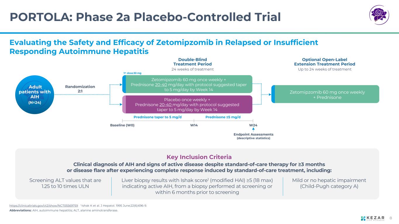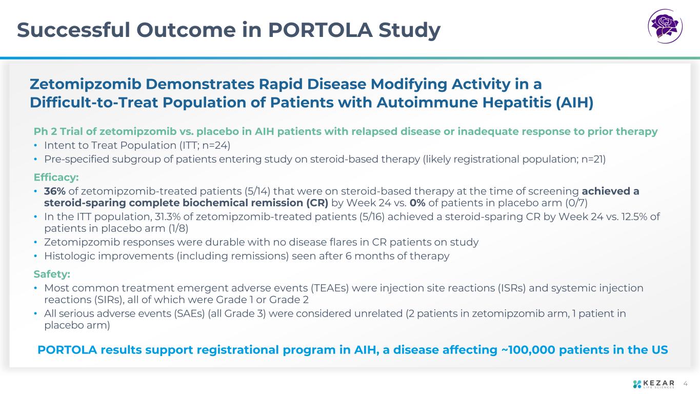 Successful Outcome in PORTOLA Study 4 Ph 2 Trial of zetomipzomib vs. placebo in AIH patients with relapsed disease or inadequate response to prior therapy • Intent to Treat Population (ITT; n=24) • Pre-specified subgroup of patients entering study on steroid-based therapy (likely registrational population; n=21) Efficacy: • 36% of zetomipzomib-treated patients (5/14) that were on steroid-based therapy at the time of screening achieved a steroid-sparing complete biochemical remission (CR) by Week 24 vs. 0% of patients in placebo arm (0/7) • In the ITT population, 31.3% of zetomipzomib-treated patients (5/16) achieved a steroid-sparing CR by Week 24 vs. 12.5% of patients in placebo arm (1/8) • Zetomipzomib responses were durable with no disease flares in CR patients on study • Histologic improvements (including remissions) seen after 6 months of therapy Safety: • Most common treatment emergent adverse events (TEAEs) were injection site reactions (ISRs) and systemic injection reactions (SIRs), all of which were Grade 1 or Grade 2 • All serious adverse events (SAEs) (all Grade 3) were considered unrelated (2 patients in zetomipzomib arm, 1 patient in placebo arm) Zetomipzomib Demonstrates Rapid Disease Modifying Activity in a Difficult-to-Treat Population of Patients with Autoimmune Hepatitis (AIH) PORTOLA results support registrational program in AIH, a disease affecting ~100,000 patients in the US