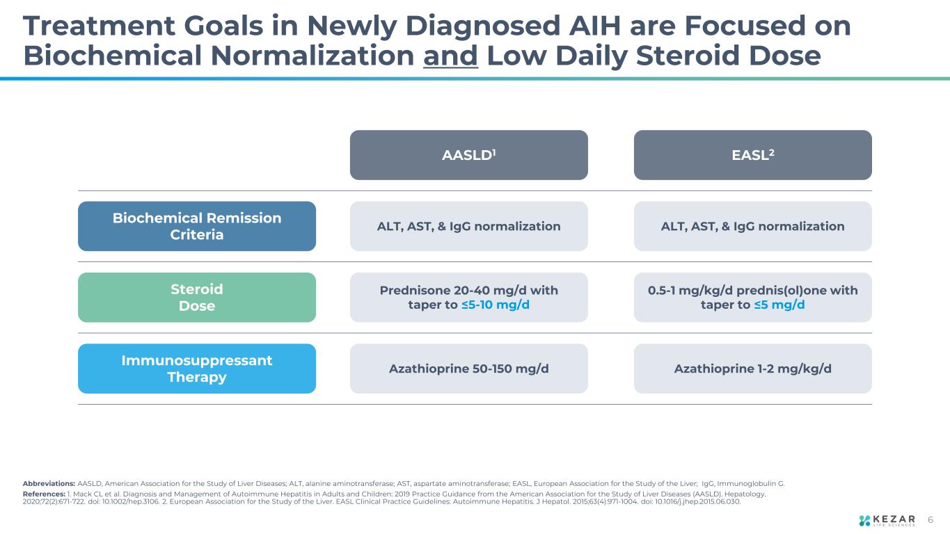 Treatment Goals in Newly Diagnosed AIH are Focused on Biochemical Normalization and Low Daily Steroid Dose Abbreviations: AASLD, American Association for the Study of Liver Diseases; ALT, alanine aminotransferase; AST, aspartate aminotransferase; EASL, European Association for the Study of the Liver; IgG, Immunoglobulin G. References: 1. Mack CL et al. Diagnosis and Management of Autoimmune Hepatitis in Adults and Children: 2019 Practice Guidance from the American Association for the Study of Liver Diseases (AASLD). Hepatology. 2020;72(2):671-722. doi: 10.1002/hep.3106. 2. European Association for the Study of the Liver. EASL Clinical Practice Guidelines: Autoimmune Hepatitis. J Hepatol. 2015;63(4):971-1004. doi: 10.1016/j.jhep.2015.06.030. Biochemical Remission Criteria ALT, AST, & IgG normalization ALT, AST, & IgG normalization Steroid Dose Prednisone 20-40 mg/d with taper to ≤5-10 mg/d 0.5-1 mg/kg/d prednis(ol)one with taper to ≤5 mg/d Immunosuppressant Therapy Azathioprine 50-150 mg/d Azathioprine 1-2 mg/kg/d AASLD1 EASL2 6