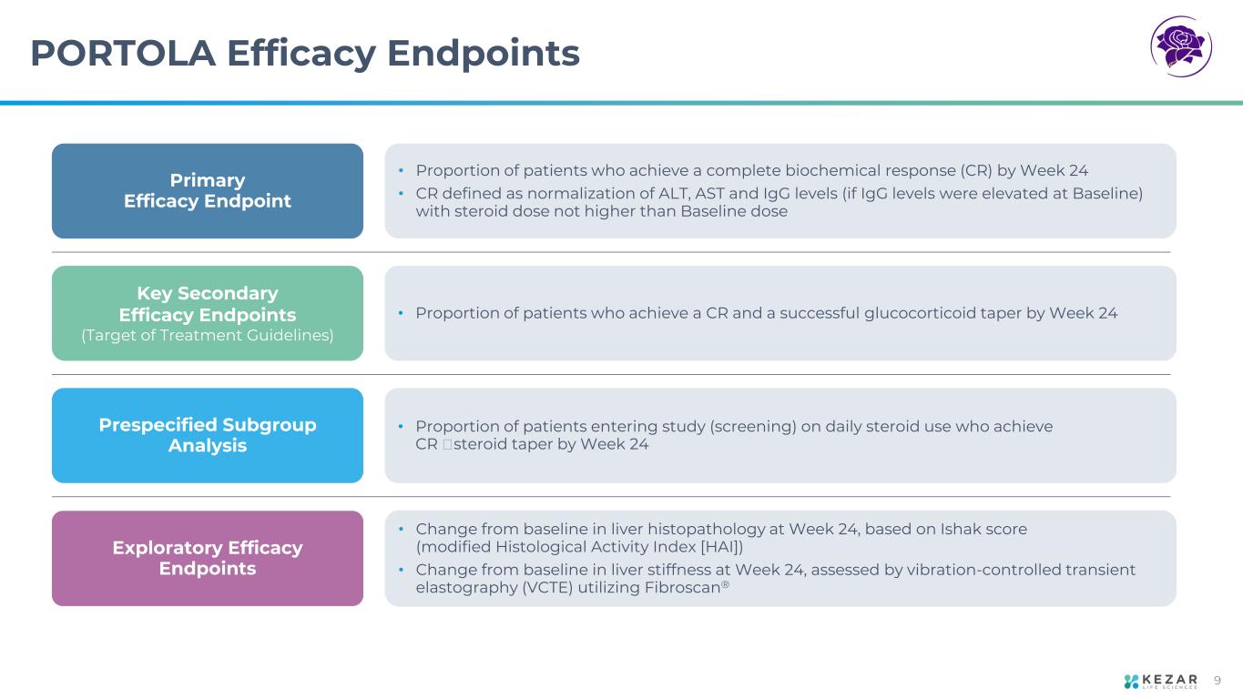 Evaluating the Safety and Efficacy of Zetomipzomib in Relapsed or Insufficient Responding Autoimmune Hepatitis PORTOLA: Phase 2a Placebo-Controlled Trial Adult patients with AIH (N=24) Optional Open-Label Extension Treatment Period Randomization 2:1 Up to 24 weeks of treatment Zetomipzomib 60 mg once weekly + Prednisone Double-Blind Treatment Period 1st dose 30 mg Zetomipzomib 60 mg once weekly + Prednisone 20-40 mg/day with protocol suggested taper to 5 mg/day by Week 14 Prednisone taper to 5 mg/d W14Baseline (W0) W24 24 weeks of treatment Endpoint Assessments (descriptive statistics) Prednisone ≤5 mg/d https://clinicaltrials.gov/ct2/show/NCT05569759 1.Ishak K et al. J Hepatol. 1995 June;22(6):696-9. Abbreviations: AIH, autoimmune hepatitis; ALT, alanine aminotransferase. Clinical diagnosis of AIH and signs of active disease despite standard-of-care therapy for ≥3 months or disease flare after experiencing complete response induced by standard-of-care treatment, including: Key Inclusion Criteria Placebo once weekly + Prednisone 20-40 mg/day with protocol suggested taper to 5 mg/day by Week 14 Screening ALT values that are 1.25 to 10 times ULN Liver biopsy results with Ishak score1 (modified HAI) ≥5 (18 max) indicating active AIH, from a biopsy performed at screening or within 6 months prior to screening Mild or no hepatic impairment (Child-Pugh category A) 8
