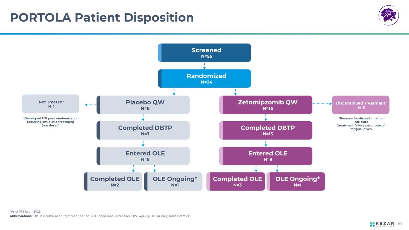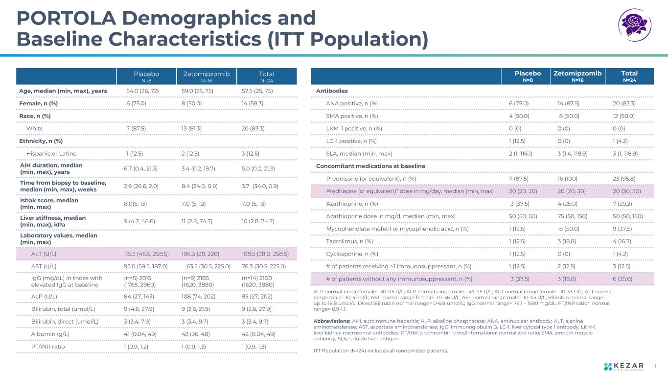 Completed OLE N=3 OLE Ongoing* N=1 Entered OLE N=9 Completed DBTP N=13 Zetomipzomib QW N=16 Discontinued Treatment† N=3 †Reasons for discontinuation: AIH flare (treatment failure per protocol), fatigue, hives, PORTOLA Patient Disposition *As of 01-March 2025. Abbreviations: DBTP, double-blind treatment period; OLE, open-label extension; QW, weekly; UTI: Urinary Tract Infection. ^Developed UTI post randomization requiring antibiotic treatment (not dosed) Randomized N=24 Screened N=55 Completed OLE N=2 OLE Ongoing* N=1 Entered OLE N=5 Completed DBTP N=7 Placebo QW N=8 Not Treated^ N=1 10
