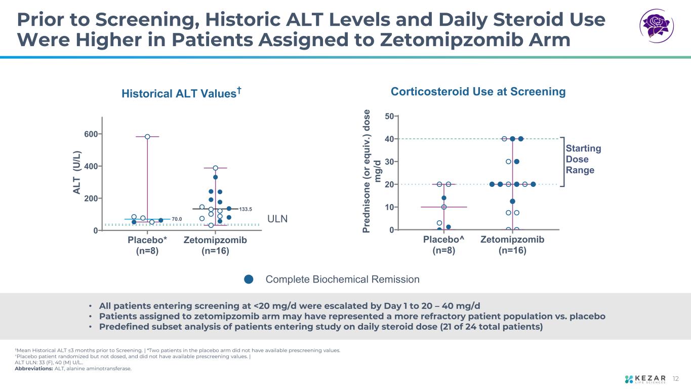 PORTOLA Demographics and Baseline Characteristics (ITT Population) Placebo N=8 Zetomipzomib N=16 Total N=24 Age, median (min, max), years 54.0 (26, 72) 59.0 (25, 75) 57.5 (25, 75) Female, n (%) 6 (75.0) 8 (50.0) 14 (58.3) Race, n (%) White 7 (87.5) 13 (81.3) 20 (83.3) Ethnicity, n (%) Hispanic or Latino 1 (12.5) 2 (12.5) 3 (12.5) AIH duration, median (min, max), years 6.7 (0.4, 21.3) 3.4 (0.2, 19.7) 5.0 (0.2, 21.3) Time from biopsy to baseline, median (min, max), weeks 2.9 (26.6, 2.0) 8.4 (34.0, 0.9) 3.7 (34.0, 0.9) Ishak score, median (min, max) 8.0(5, 13) 7.0 (5, 12) 7.0 (5, 13) Liver stiffness, median (min, max), kPa 9 (4.7, 48.6) 11 (2.8, 74.7) 10 (2.8, 74.7) Laboratory values, median (min, max) ALT (U/L) 115.3 (46.5, 258.5) 106.3 (38, 220) 108.5 (38.0, 258.5) AST (U/L) 95.0 (59.5, 187.0) 63.5 (30.5, 225.0) 76.3 (30.5, 225.0) IgG (mg/dL) in those with elevated IgG at baseline (n=5) 2015 (1765, 2960) (n=9) 2185 (1620, 3880) (n=14) 2100 (1620, 3880) ALP (U/L) 84 (27, 143) 108 (74, 202) 95 (27, 202) Bilirubin, total (umol/L) 9 (4.6, 27.9) 9 (2.6, 21.9) 9 (2.6, 27.9) Bilirubin, direct (umol/L) 3 (3.4, 7.9) 3 (3.4, 9.7) 3 (3.4, 9.7) Albumin (g/L) 41 (0.04, 49) 42 (36, 48) 42 (0.04, 49) PT/INR ratio 1 (0.9, 1.2) 1 (0.9, 1.3) 1 (0.9, 1.3) Placebo N=8 Zetomipzomib N=16 Total N=24 Antibodies ANA positive, n (%) 6 (75.0) 14 (87.5) 20 (83.3) SMA positive, n (%) 4 (50.0) 8 (50.0) 12 (50.0) LKM-1 positive, n (%) 0 (0) 0 (0) 0 (0) LC-1 positive, n (%) 1 (12.5) 0 (0) 1 (4.2) SLA, median (min, max) 2 (1, 116.1) 3 (1.4, 118.9) 3 (1, 118.9) Concomitant medications at baseline Prednisone (or equivalent), n (%) 7 (87.5) 16 (100) 23 (95.8) Prednisone (or equivalent)* dose in mg/day, median (min, max) 20 (20, 20) 20 (20, 30) 20 (20, 30) Azathioprine, n (%) 3 (37.5) 4 (25.0) 7 (29.2) Azathioprine dose in mg/d, median (min, max) 50 (50, 50) 75 (50, 150) 50 (50, 150) Mycophenolate mofetil or mycophenolic acid, n (%) 1 (12.5) 8 (50.0) 9 (37.5) Tacrolimus, n (%) 1 (12.5) 3 (18.8) 4 (16.7) Cyclosporine, n (%) 1 (12.5) 0 (0) 1 (4.2) # of patients receiving >1 immunosuppressant, n (%) 1 (12.5) 2 (12.5) 3 (12.5) # of patients without any immunosuppressant, n (%) 3 (37.5) 3 (18.8) 6 (25.0) Abbreviations: AIH, autoimmune hepatitis; ALP, alkaline phosphatase; ANA, antinuclear antibody; ALT, alanine aminotransferase; AST, aspartate aminotransferase; IgG, immunoglobulin G; LC-1, liver cytosol type 1 antibody; LKM-1, liver kidney microsomal antibodies; PT/INR, prothrombin time/international normalized ratio; SMA, smooth muscle antibody; SLA, soluble liver antigen. ALP normal range female= 30-115 U/L; ALP normal range male= 43-115 U/L; ALT normal range female= 10-33 U/L; ALT normal range male= 10-40 U/L; AST normal range female= 10–36 U/L; AST normal range male= 10-43 U/L; Bilirubin normal range= up to 18.8 umol/L; Direct Bilirubin normal range= 0-6.8 umol/L; IgG normal range= 767 – 1590 mg/dL; PT/INR ration normal range= 0.9-1.1. ITT Population (N=24) includes all randomized patients. 11