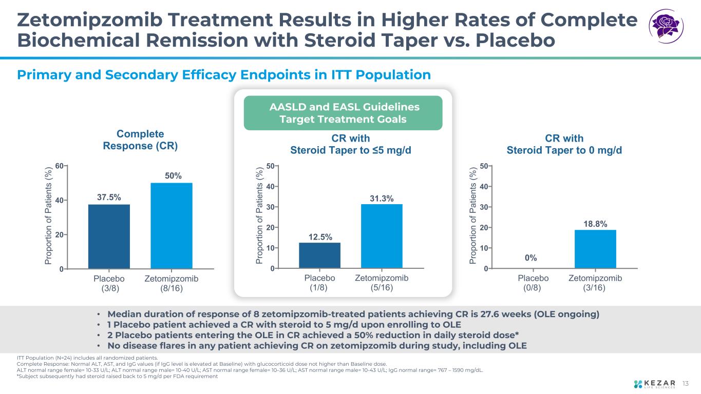 Prior to Screening, Historic ALT Levels and Daily Steroid Use Were Higher in Patients Assigned to Zetomipzomib Arm †Mean Historical ALT ≤3 months prior to Screening. | *Two patients in the placebo arm did not have available prescreening values. ^Placebo patient randomized but not dosed, and did not have available prescreening values. | ALT ULN: 33 (F), 40 (M) U/L.. Abbreviations: ALT, alanine aminotransferase. Placebo* (n=8) Zetomipzomib (n=16) 0 200 400 600 Historical ALT Values† AL T (U /L ) 70.0 133.5 Placebo^ (n=8) Zetomipzomib (n=16) 0 10 20 30 40 50 Corticosteroid Use at Screening Pr ed ni so ne (o r e qu iv .) do se m g/ d Starting Dose Range ULN Complete Biochemical Remission • All patients entering screening at <20 mg/d were escalated by Day 1 to 20 – 40 mg/d • Patients assigned to zetomipzomib arm may have represented a more refractory patient population vs. placebo • Predefined subset analysis of patients entering study on daily steroid dose (21 of 24 total patients) 12