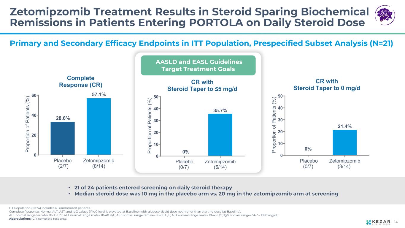 AASLD and EASL Guidelines Target Treatment Goals Placebo (3/8) Zetomipzomib (8/16) 0 20 40 60 Complete Response (CR) Pr op or tio n of P at ie nt s (% ) 37.5% 50% Placebo (1/8) Zetomipzomib (5/16) 0 10 20 30 40 50 CR with Steroid Taper to ≤5 mg/d Pr op or tio n of P at ie nt s (% ) 31.3% 12.5% Placebo (0/8) Zetomipzomib (3/16) 0 10 20 30 40 50 CR with Steroid Taper to 0 mg/d Pr op or tio n of P at ie nt s (% ) 37.5% 18.8% 0% 13 Zetomipzomib Treatment Results in Higher Rates of Complete Biochemical Remission with Steroid Taper vs. Placebo ITT Population (N=24) includes all randomized patients. Complete Response: Normal ALT, AST, and IgG values (if IgG level is elevated at Baseline) with glucocorticoid dose not higher than Baseline dose. ALT normal range female= 10-33 U/L; ALT normal range male= 10-40 U/L; AST normal range female= 10–36 U/L; AST normal range male= 10-43 U/L; IgG normal range= 767 – 1590 mg/dL. *Subject subsequently had steroid raised back to 5 mg/d per FDA requirement • Median duration of response of 8 zetomipzomib-treated patients achieving CR is 27.6 weeks (OLE ongoing) • 1 Placebo patient achieved a CR with steroid to 5 mg/d upon enrolling to OLE • 2 Placebo patients entering the OLE in CR achieved a 50% reduction in daily steroid dose* • No disease flares in any patient achieving CR on zetomipzomib during study, including OLE Primary and Secondary Efficacy Endpoints in ITT Population