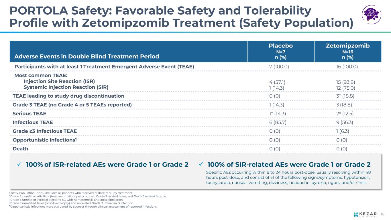 PORTOLA Safety: Favorable Safety and Tolerability Profile with Zetomipzomib Treatment (Safety Population) Adverse Events in Double Blind Treatment Period Placebo N=7 n (%) Zetomipzomib N=16 n (%) Participants with at least 1 Treatment Emergent Adverse Event (TEAE) 7 (100.0) 16 (100.0) Most common TEAE: Injection Site Reaction (ISR) Systemic Injection Reaction (SIR) 4 (57.1) 1 (14.3) 15 (93.8) 12 (75.0) TEAE leading to study drug discontinuation 0 (0) 3* (18.8) Grade 3 TEAE (no Grade 4 or 5 TEAEs reported) 1 (14.3) 3 (18.8) Serious TEAE 1† (14.3) 2‡ (12.5) Infectious TEAE 6 (85.7) 9 (56.3) Grade ≥3 Infectious TEAE 0 (0) 1 (6.3) Opportunistic Infections¶ 0 (0) 0 (0) Death 0 (0) 0 (0) Safety Population (N=23) includes all patients who received ≥1 dose of study treatment. *Grade 2 unrelated AIH flare (treatment failure per protocol), Grade 2 related hives, and Grade 1 related fatigue. †Grade 3 unrelated variceal bleeding x2, with hematemesis and atrial fibrillation. ‡Grade 3 unrelated fever (post-liver biopsy) and unrelated Grade 3 Influenza B infection. ¶Opportunistic infections were evaluated by sponsor through clinical assessment of reported infections. Specific AEs occurring within 8 to 24 hours post-dose, usually resolving within 48 hours post-dose, and consist of ≥1 of the following signs/symptoms: hypotension, tachycardia, nausea, vomiting, dizziness, headache, pyrexia, rigors, and/or chills 16  100% of SIR-related AEs were Grade 1 or Grade 2 100% of ISR-related AEs were Grade 1 or Grade 2