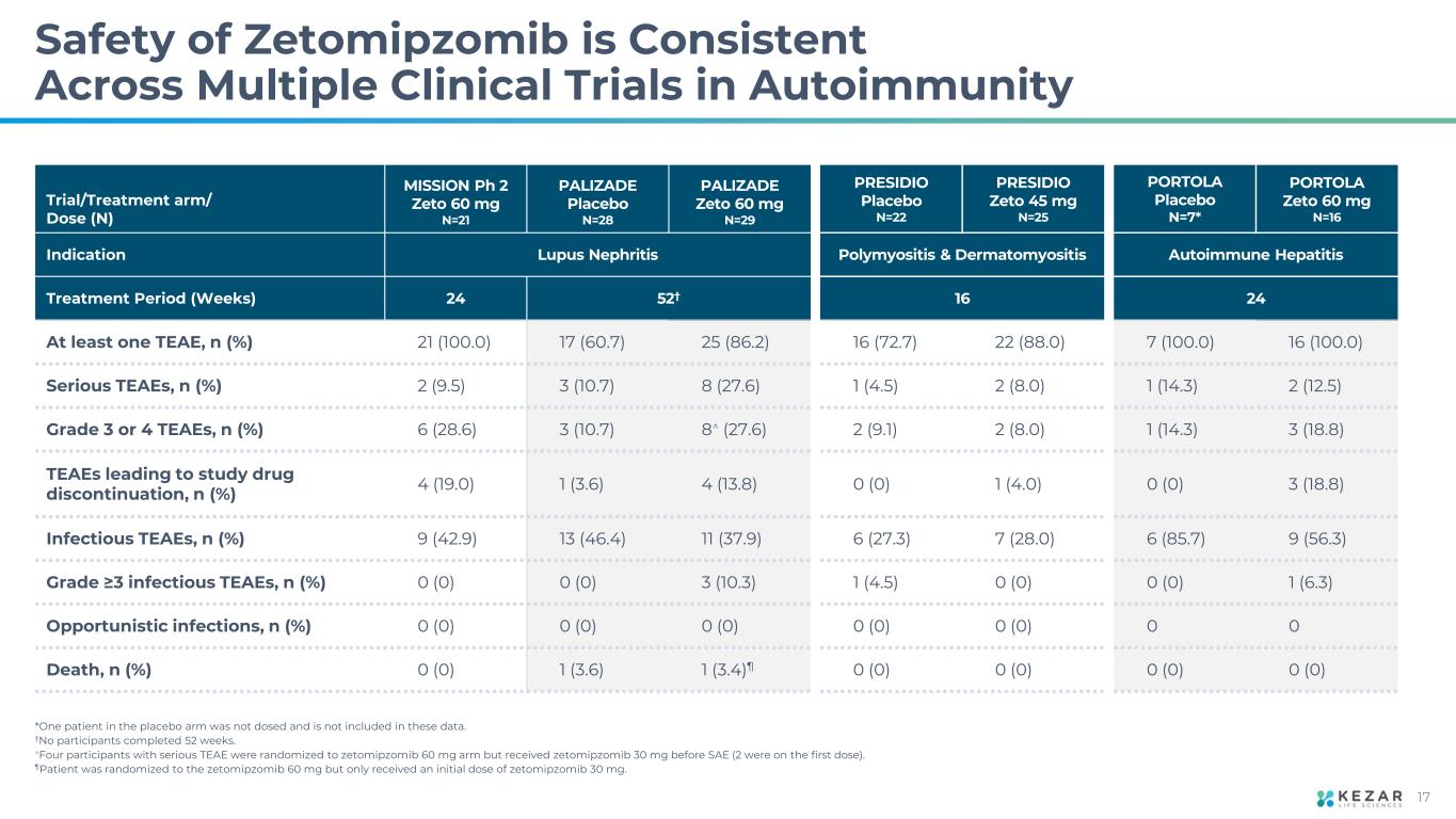 Trial/Treatment arm/ Dose (N) MISSION Ph 2 Zeto 60 mg N=21 PALIZADE Placebo N=28 PALIZADE Zeto 60 mg N=29 Indication Lupus Nephritis Treatment Period (Weeks) 24 52† At least one TEAE, n (%) 21 (100.0) 17 (60.7) 25 (86.2) Serious TEAEs, n (%) 2 (9.5) 3 (10.7) 8 (27.6) Grade 3 or 4 TEAEs, n (%) 6 (28.6) 3 (10.7) 8^ (27.6) TEAEs leading to study drug discontinuation, n (%) 4 (19.0) 1 (3.6) 4 (13.8) Infectious TEAEs, n (%) 9 (42.9) 13 (46.4) 11 (37.9) Grade ≥3 infectious TEAEs, n (%) 0 (0) 0 (0) 3 (10.3) Opportunistic infections, n (%) 0 (0) 0 (0) 0 (0) Death, n (%) 0 (0) 1 (3.6) 1 (3.4)¶ PRESIDIO Placebo N=22 PRESIDIO Zeto 45 mg N=25 Polymyositis & Dermatomyositis 16 16 (72.7) 22 (88.0) 1 (4.5) 2 (8.0) 2 (9.1) 2 (8.0) 0 (0) 1 (4.0) 6 (27.3) 7 (28.0) 1 (4.5) 0 (0) 0 (0) 0 (0) 0 (0) 0 (0) Safety of Zetomipzomib is Consistent Across Multiple Clinical Trials in Autoimmunity *One patient in the placebo arm was not dosed and is not included in these data. †No participants completed 52 weeks. ^Four participants with serious TEAE were randomized to zetomipzomib 60 mg arm but received zetomipzomib 30 mg before SAE (2 were on the first dose). ¶Patient was randomized to the zetomipzomib 60 mg but only received an initial dose of zetomipzomib 30 mg. PORTOLA Placebo N=7* PORTOLA Zeto 60 mg N=16 Autoimmune Hepatitis 24 7 (100.0) 16 (100.0) 1 (14.3) 2 (12.5) 1 (14.3) 3 (18.8) 0 (0) 3 (18.8) 6 (85.7) 9 (56.3) 0 (0) 1 (6.3) 0 0 0 (0) 0 (0) 17