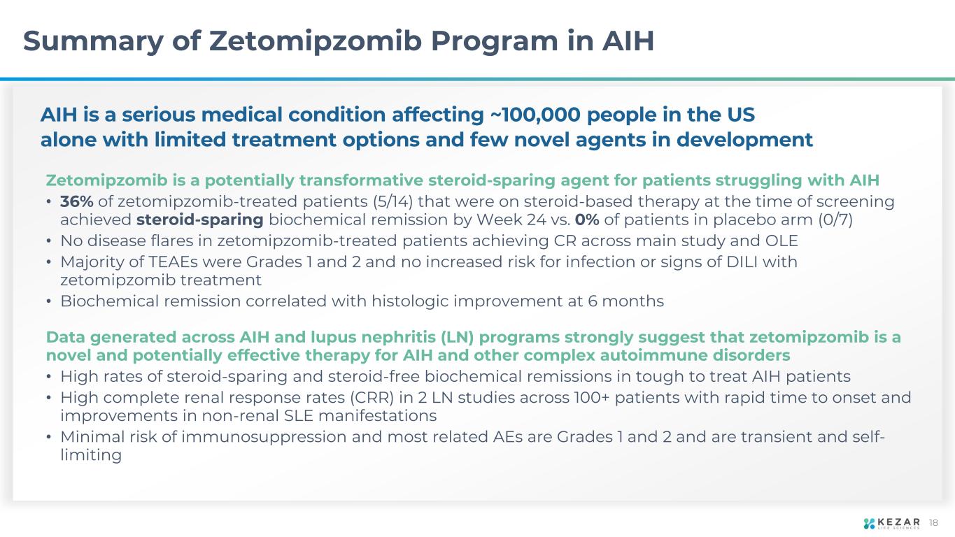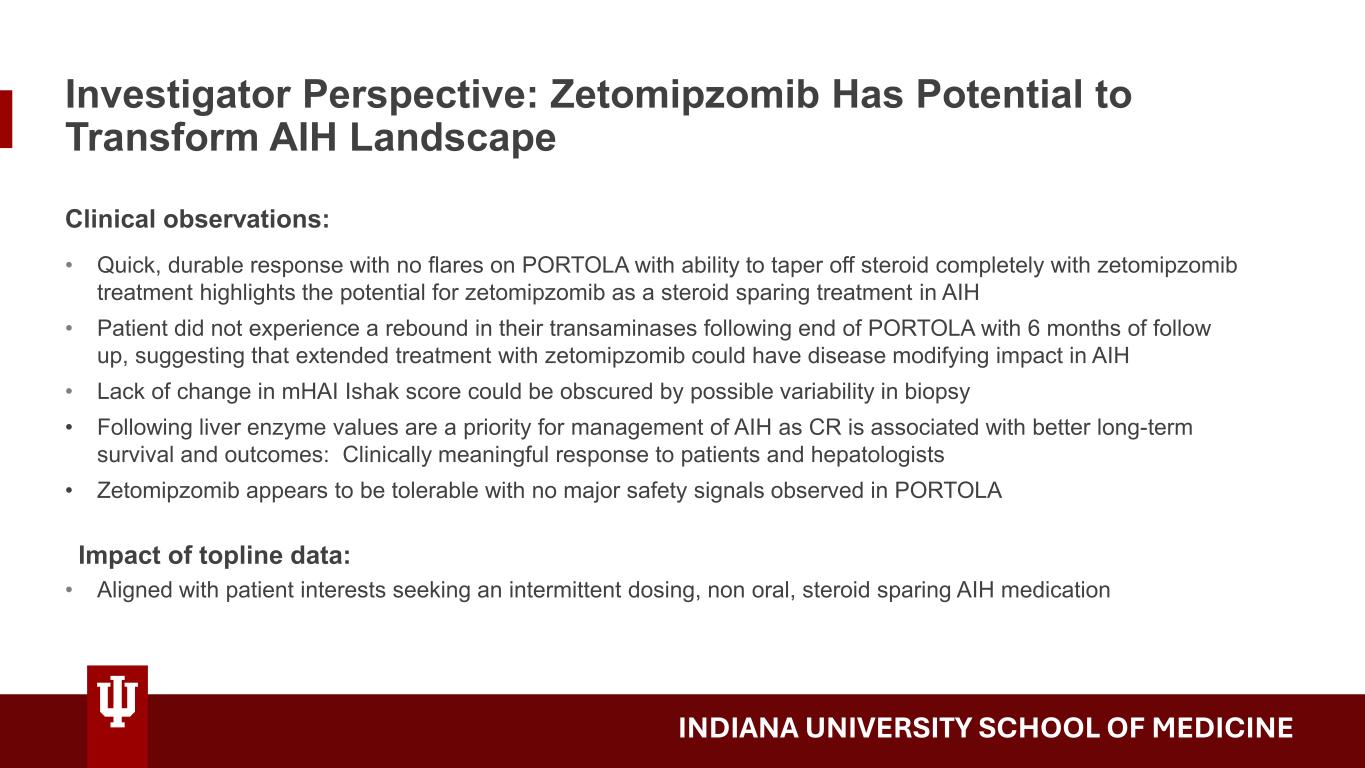 INDIANA UNIVERSITY SCHOOL OF MEDICINE Investigator Perspective: Zetomipzomib Has Potential to Transform AIH Landscape Clinical observations: • Quick, durable response with no flares on PORTOLA with ability to taper off steroid completely with zetomipzomib treatment highlights the potential for zetomipzomib as a steroid sparing treatment in AIH • Patient did not experience a rebound in their transaminases following end of PORTOLA with 6 months of follow up, suggesting that extended treatment with zetomipzomib could have disease modifying impact in AIH • Lack of change in mHAI Ishak score could be obscured by possible variability in biopsy • Following liver enzyme values are a priority for management of AIH as CR is associated with better long-term survival and outcomes: Clinically meaningful response to patients and hepatologists • Zetomipzomib appears to be tolerable with no major safety signals observed in PORTOLA Impact of topline data: • Aligned with patient interests seeking an intermittent dosing, non oral, steroid sparing AIH medication