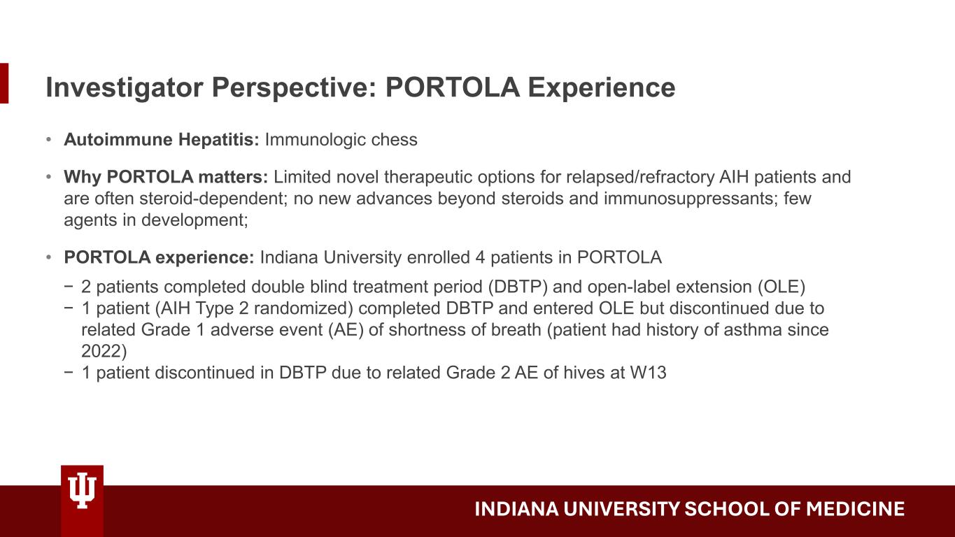 INDIANA UNIVERSITY SCHOOL OF MEDICINE Investigator Perspective: PORTOLA Experience • Autoimmune Hepatitis: Immunologic chess • Why PORTOLA matters: Limited novel therapeutic options for relapsed/refractory AIH patients and are often steroid-dependent; no new advances beyond steroids and immunosuppressants; few agents in development; • PORTOLA experience: Indiana University enrolled 4 patients in PORTOLA − 2 patients completed double blind treatment period (DBTP) and open-label extension (OLE) − 1 patient (AIH Type 2 randomized) completed DBTP and entered OLE but discontinued due to related Grade 1 adverse event (AE) of shortness of breath (patient had history of asthma since 2022) − 1 patient discontinued in DBTP due to related Grade 2 AE of hives at W13