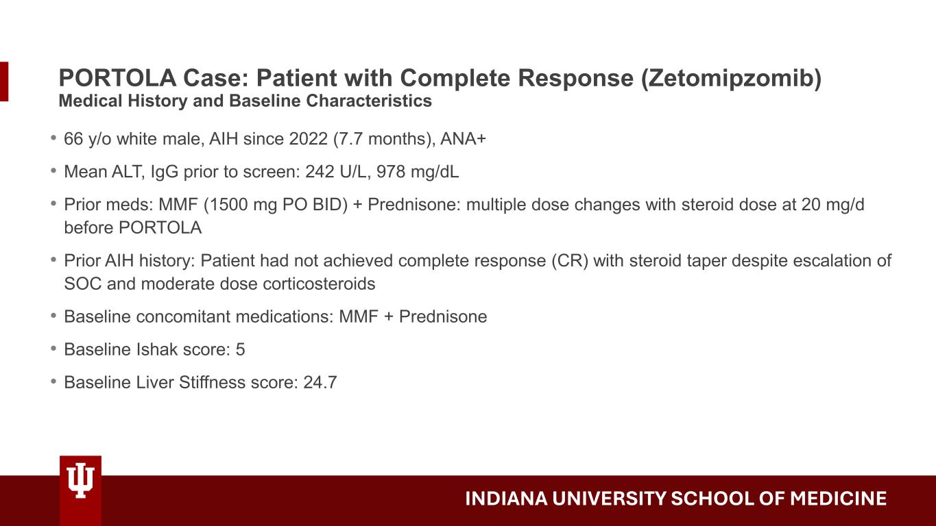 INDIANA UNIVERSITY SCHOOL OF MEDICINE PORTOLA Case: Patient with Complete Response (Zetomipzomib) Medical History and Baseline Characteristics • 66 y/o white male, AIH since 2022 (7.7 months), ANA+ • Mean ALT, IgG prior to screen: 242 U/L, 978 mg/dL • Prior meds: MMF (1500 mg PO BID) + Prednisone: multiple dose changes with steroid dose at 20 mg/d before PORTOLA • Prior AIH history: Patient had not achieved complete response (CR) with steroid taper despite escalation of SOC and moderate dose corticosteroids • Baseline concomitant medications: MMF + Prednisone • Baseline Ishak score: 5 • Baseline Liver Stiffness score: 24.7