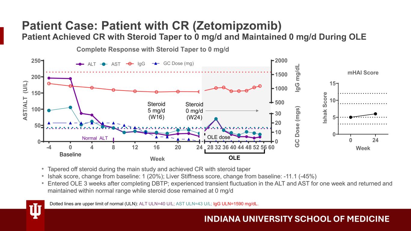 INDIANA UNIVERSITY SCHOOL OF MEDICINE Patient Case: Patient with CR (Zetomipzomib) Patient Achieved CR with Steroid Taper to 0 mg/d and Maintained 0 mg/d During OLE -4 0 4 8 12 16 20 24 0 50 100 150 200 250 0 10 20 30 500 1000 1500 2000 28 32 36 40 44 48 52 56 60 Week A ST /A LT ( U /L ) G C D os e (m gs ) Complete Response with Steroid Taper to 0 mg/d Baseline ALT IgGAST GC Dose (mg) Ig G m g/ dL Steroid 0 mg/d (W24) Normal ALT OLE OLE dose Steroid 5 mg/d (W16) 0 24 0 5 10 15 mHAI Score Week Is ha k Sc or e Dotted lines are upper limit of normal (ULN): ALT ULN=40 U/L; AST ULN=43 U/L; IgG ULN=1590 mg/dL. • Tapered off steroid during the main study and achieved CR with steroid taper • Ishak score, change from baseline: 1 (20%); Liver Stiffness score, change from baseline: -11.1 (-45%) • Entered OLE 3 weeks after completing DBTP; experienced transient fluctuation in the ALT and AST for one week and returned and maintained within normal range while steroid dose remained at 0 mg/d
