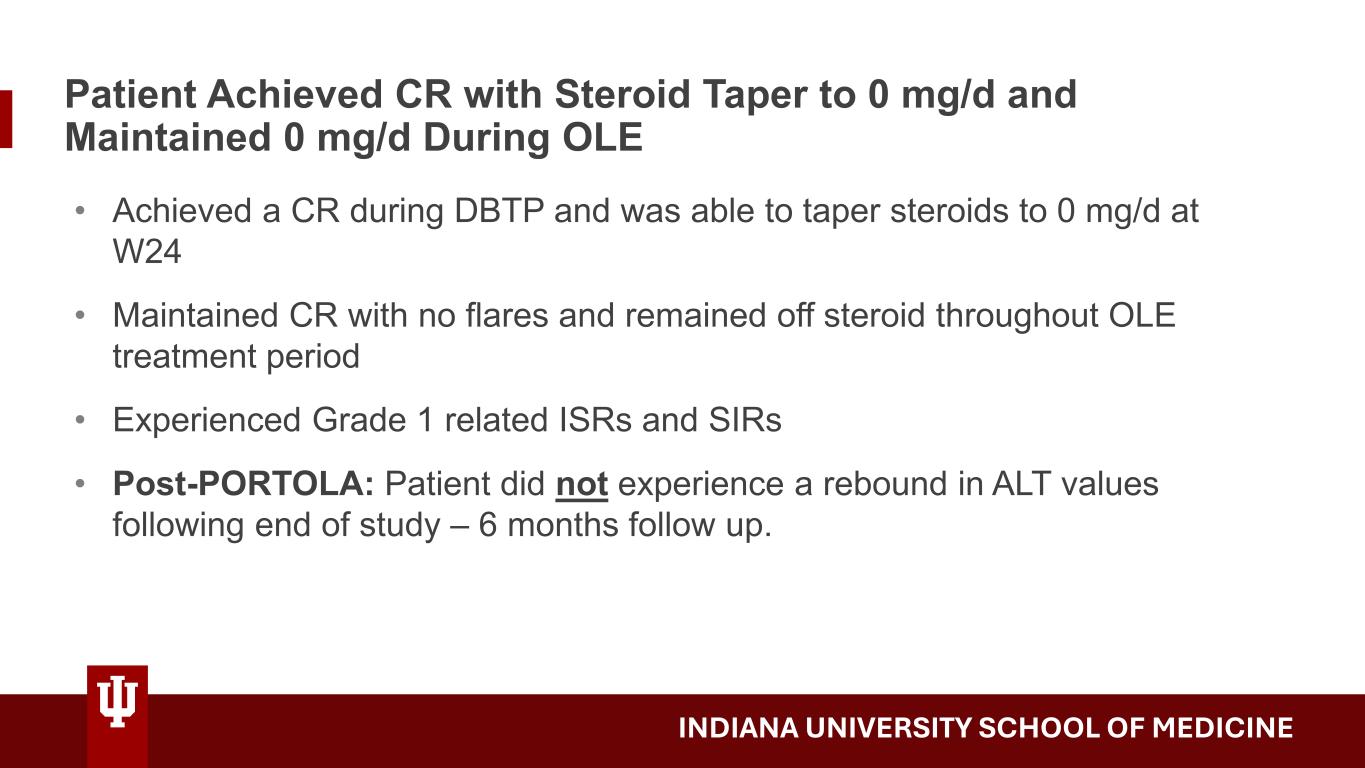 INDIANA UNIVERSITY SCHOOL OF MEDICINE Patient Achieved CR with Steroid Taper to 0 mg/d and Maintained 0 mg/d During OLE • Achieved a CR during DBTP and was able to taper steroids to 0 mg/d at W24 • Maintained CR with no flares and remained off steroid throughout OLE treatment period • Experienced Grade 1 related ISRs and SIRs • Post-PORTOLA: Patient did not experience a rebound in ALT values following end of study – 6 months follow up.